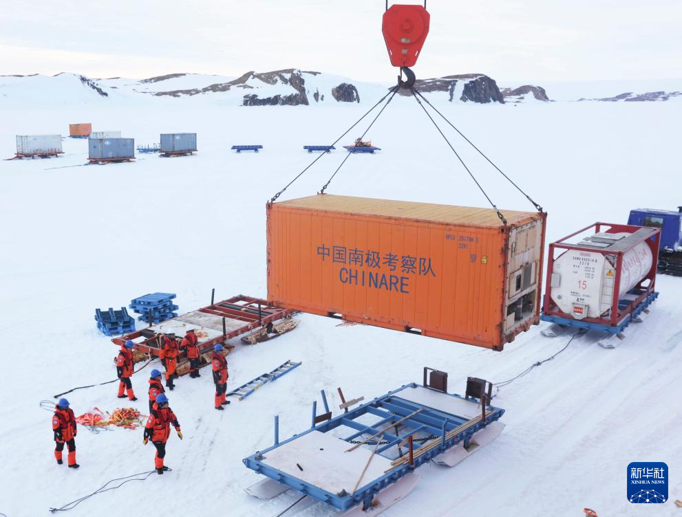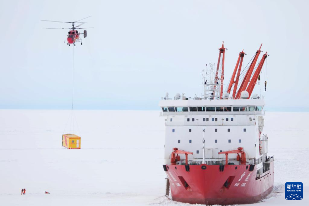 由于海冰情况复杂,“雪龙2”号短时间内无法将“雪龙”号引航至预定作业点。为保障后续任务顺利推进,考察队首次尝试将“雪龙2”号作为“摆渡船”,并成功为“雪龙”号转运部分重型物资到中山站附近的海冰卸货点,再用雪地车将货物送至中山站。“雪龙”号上其余物资直接由直升机运送上站。
