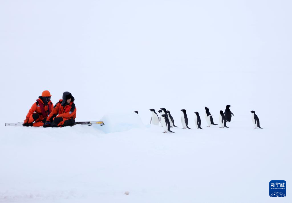 卸货中的考察队员吸引了企鹅前来“围观”(12月8日摄)。新华社记者黄韬铭摄