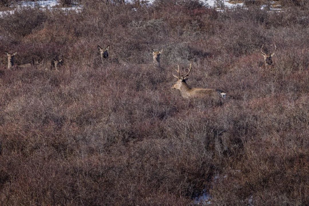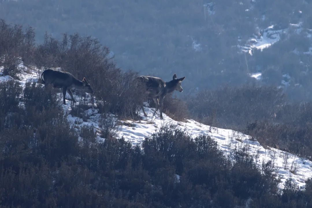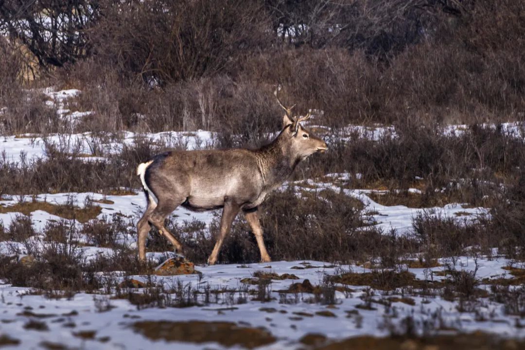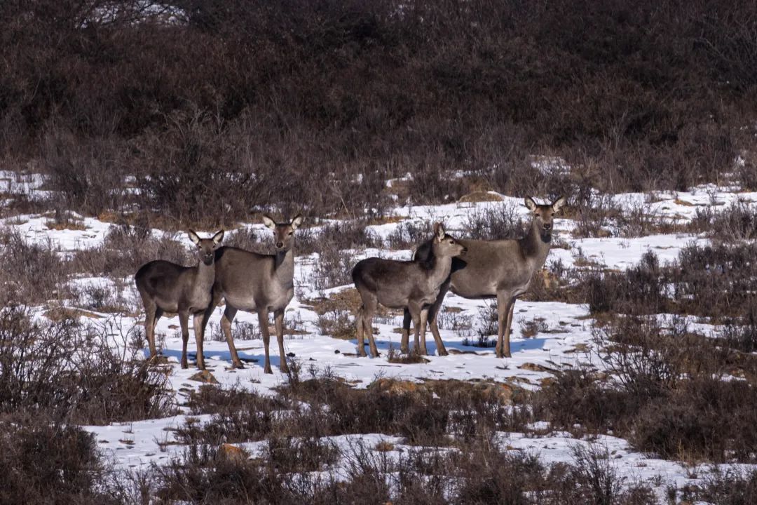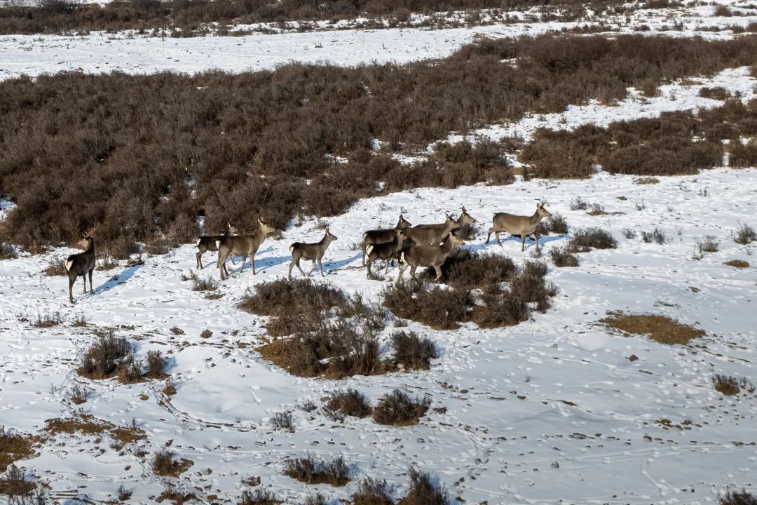 近日,在甘肃天祝抓喜秀龙草原上,成群结队的甘肃马鹿觅食、鸣叫、奔跑,为寒冷的冬日增添了生机与活力。近年来,天祝县生态环境持续改善,深山、森林、草原,已成为野生动物的天堂。