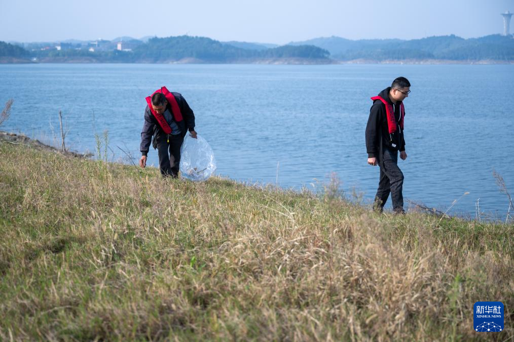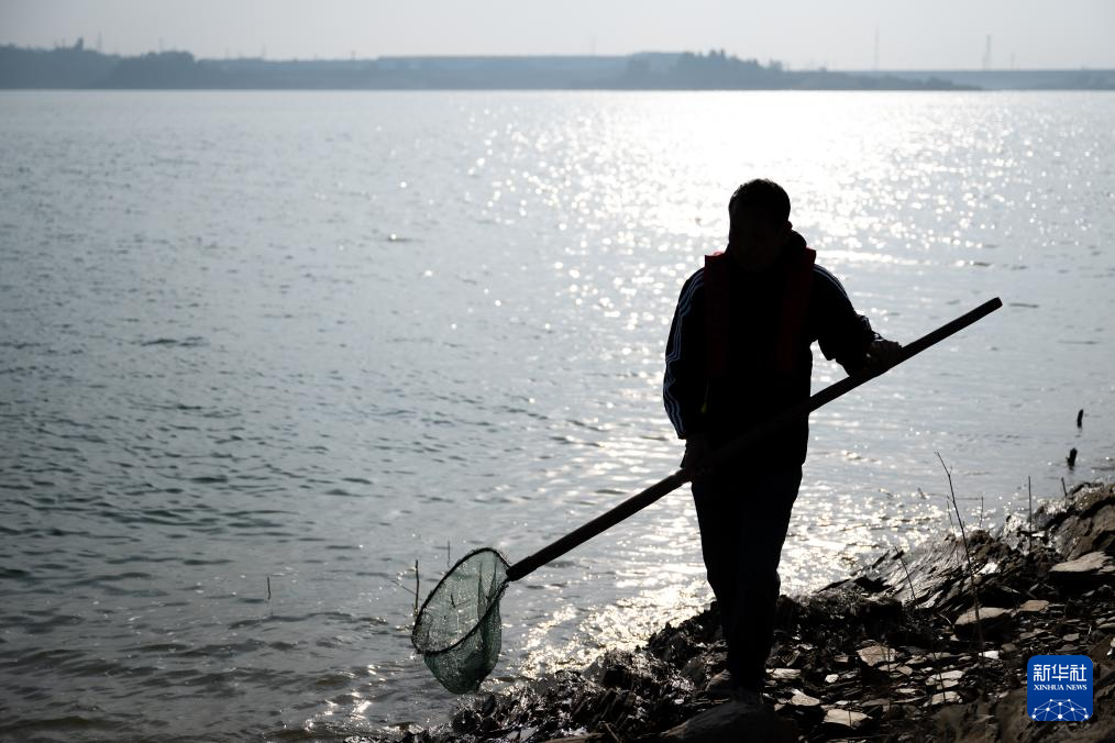 丹江口市清漂队队员在丹江口水库岸边远眺(11月30日摄)。