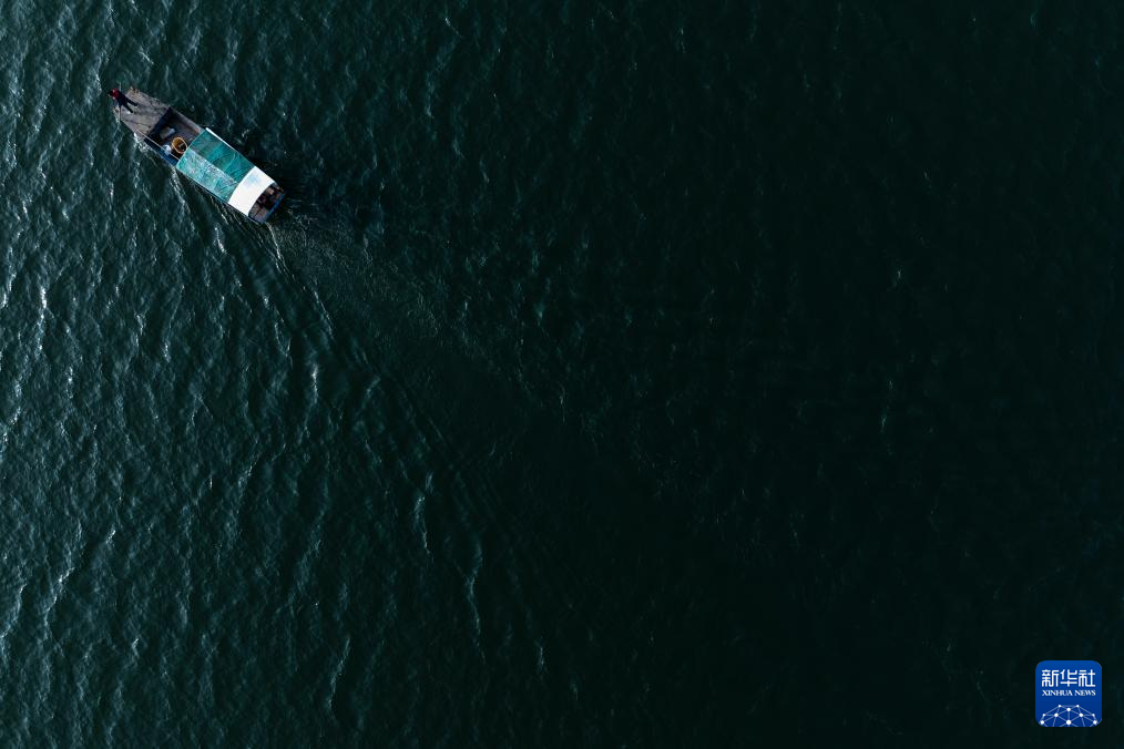 丹江口市清漂队队员在丹江口水库进行清漂作业(10月28日摄,无人机照片)。