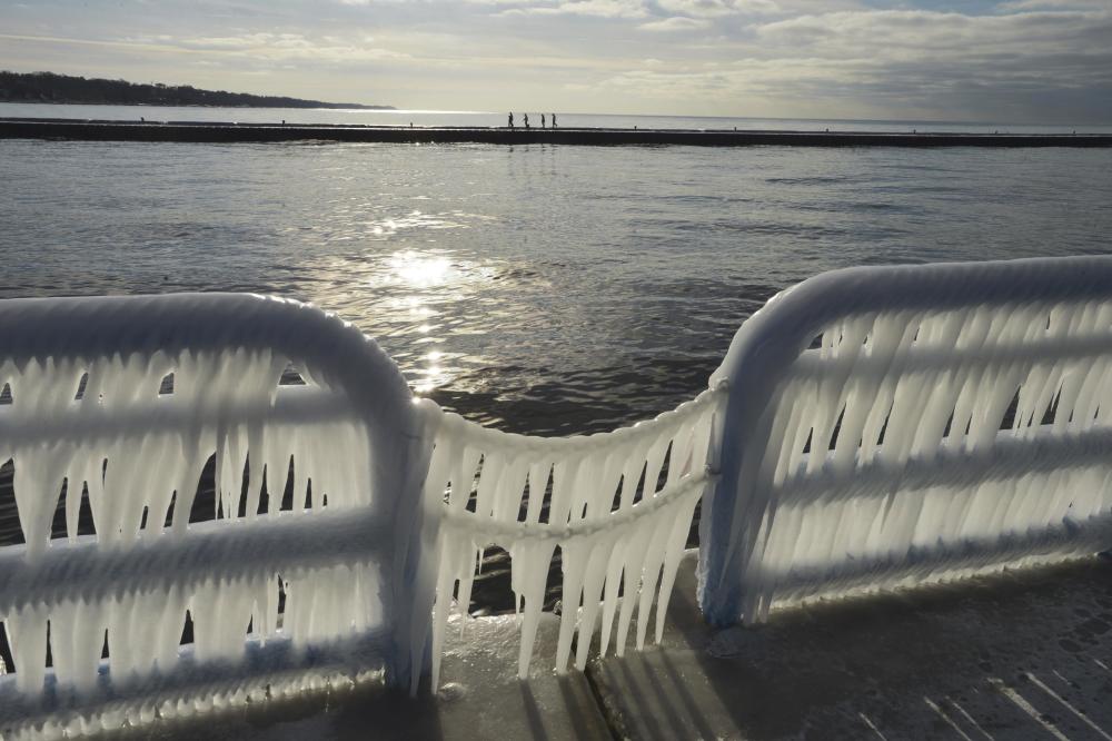 这是12月13日在美国密歇根州圣约瑟夫一处湖堤拍摄的结冰的栏杆。新华社/美联
