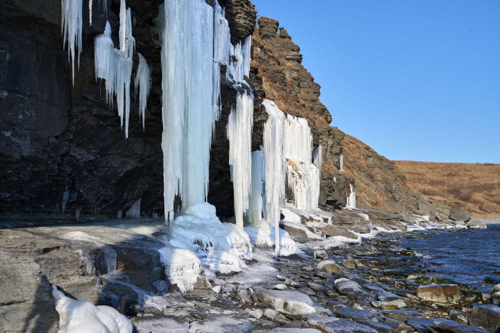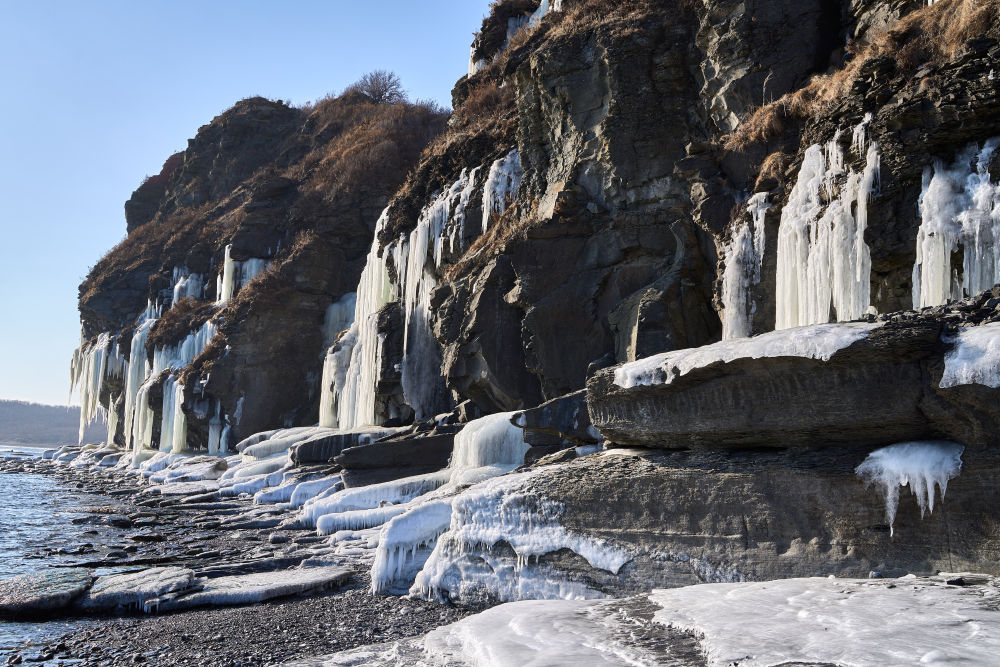 随着冬季气温持续降低,俄罗斯远东城市符拉迪沃斯托克的海边形成了壮观的冰瀑美景,形态各异的冰柱点缀山海之间。