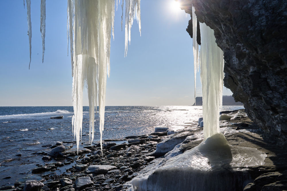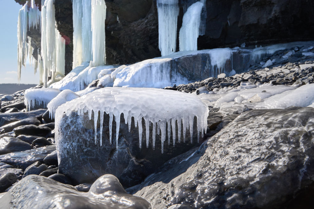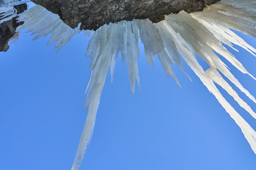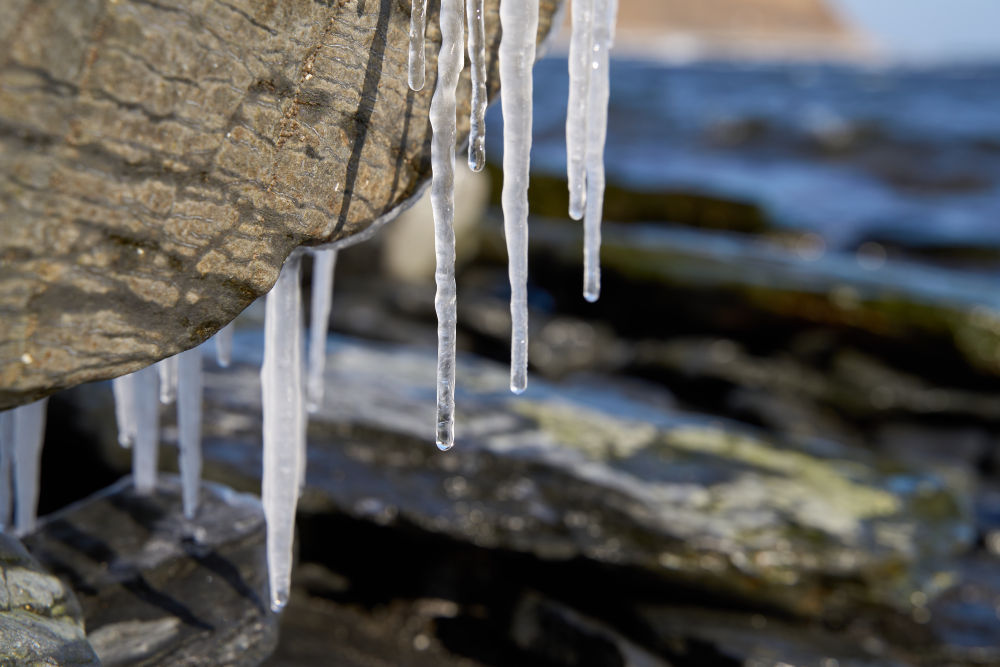 ↑12月18日,在俄罗斯符拉迪沃斯托克,小冰柱悬挂在海边的石头上。