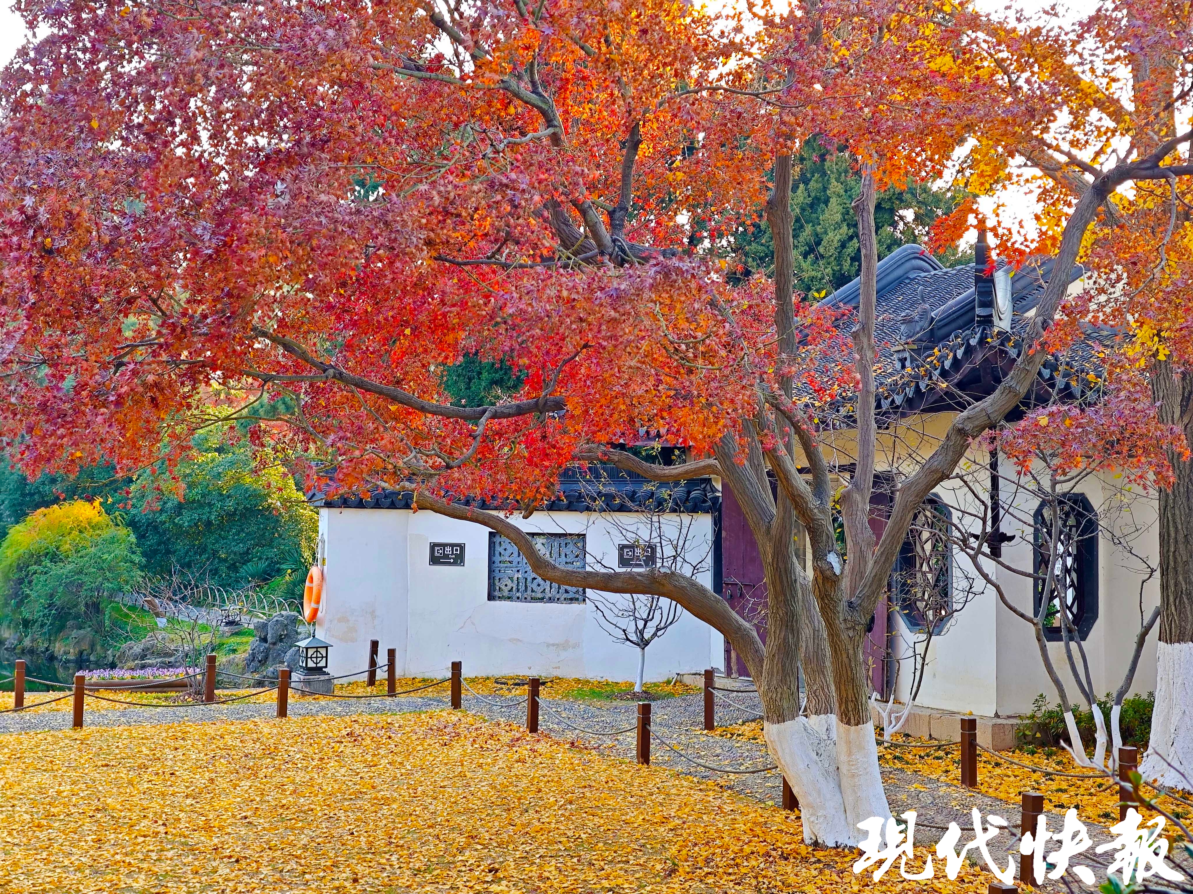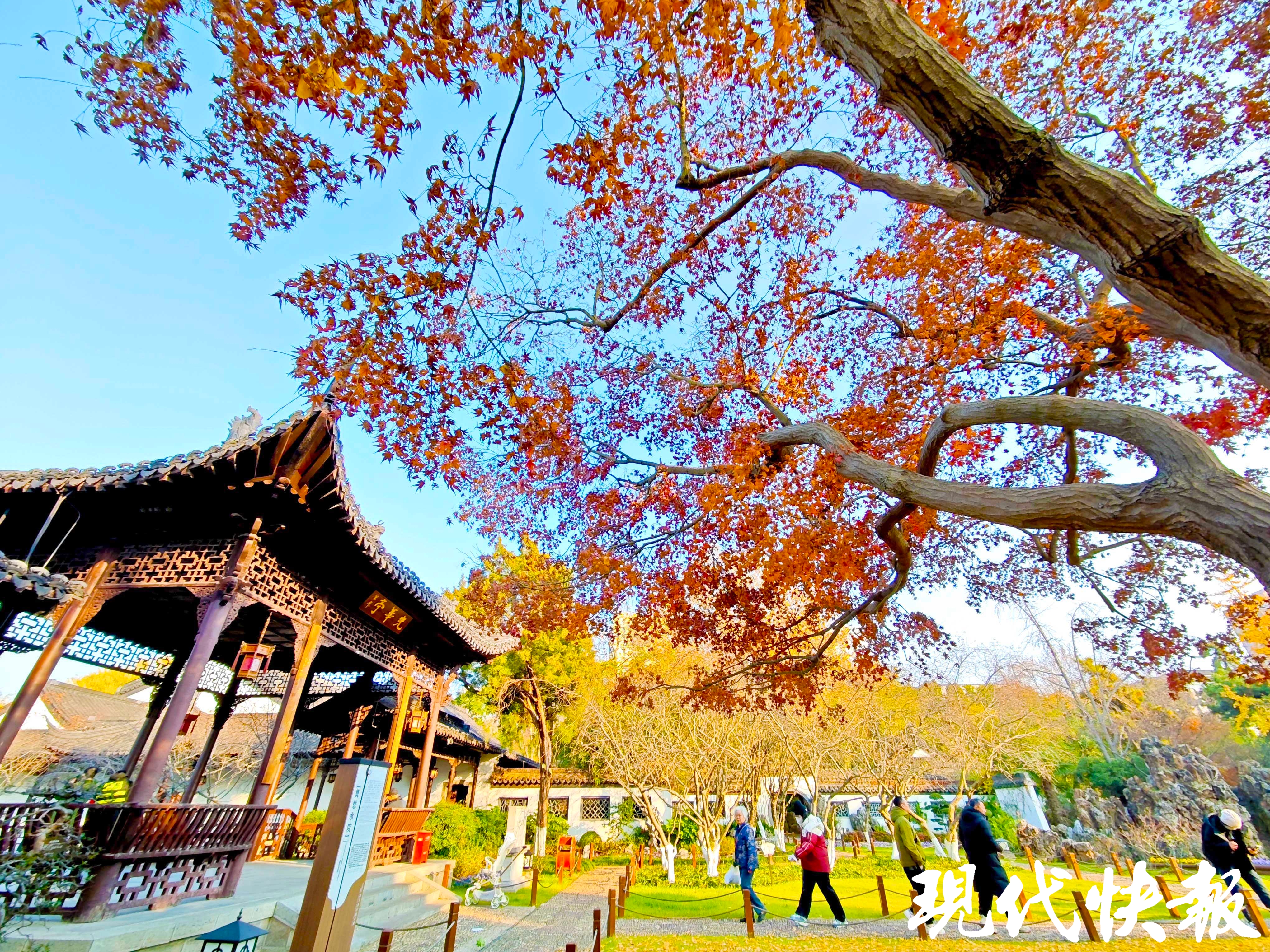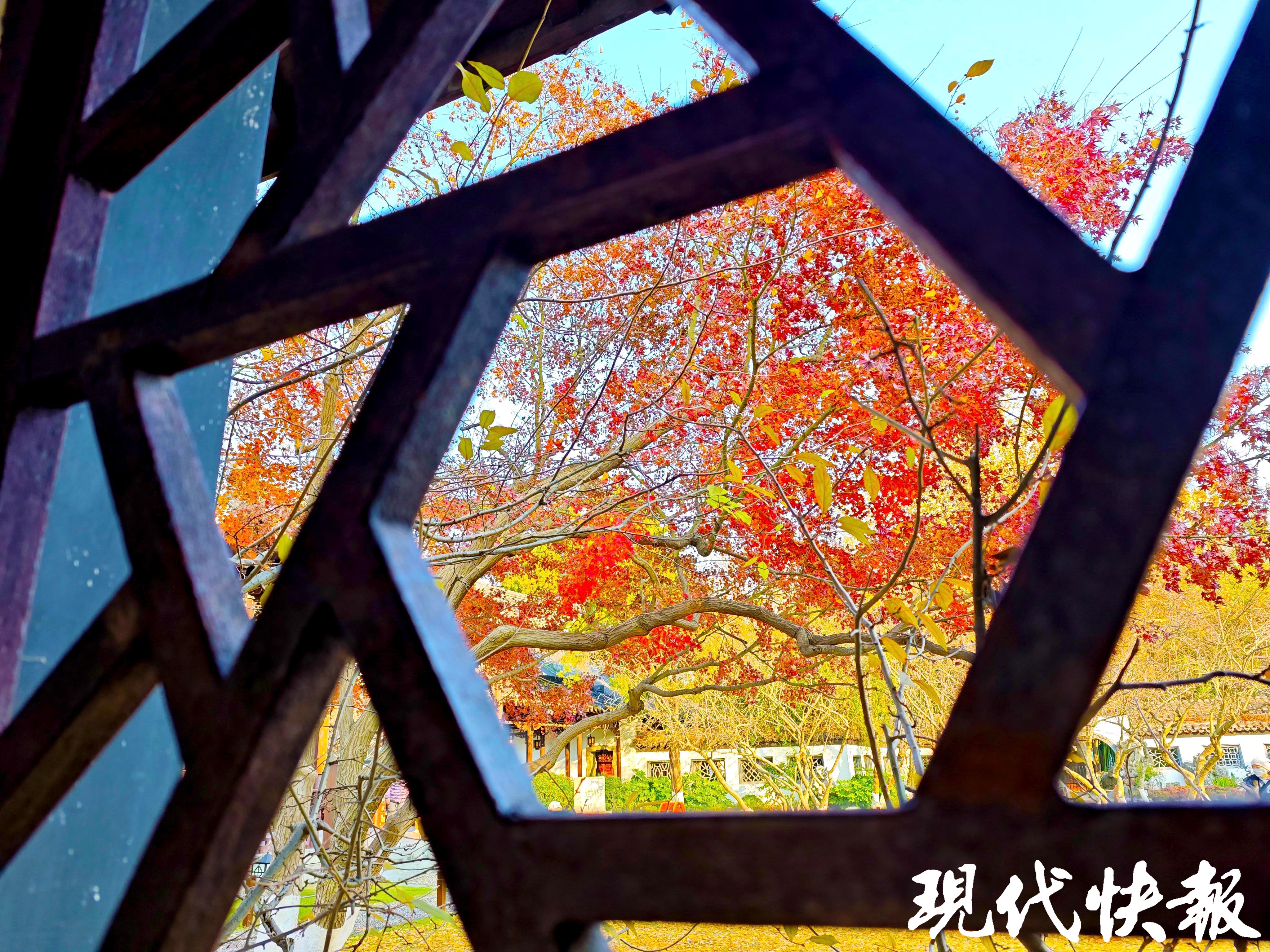 这些暖色调的叶子在阳光下熠熠生辉,最美撞色,交织着冬日的绚烂,为这座江南古典园林增色。