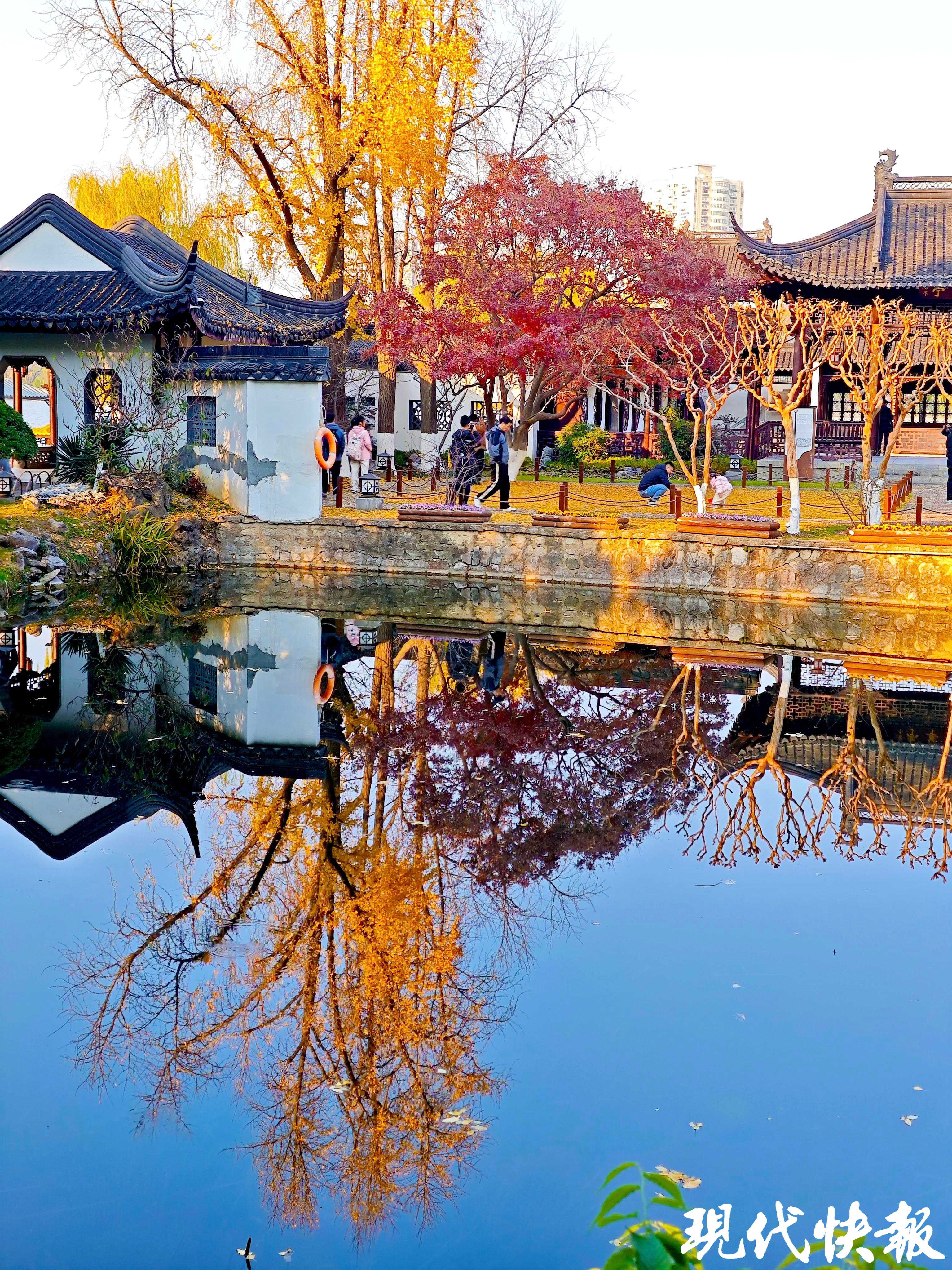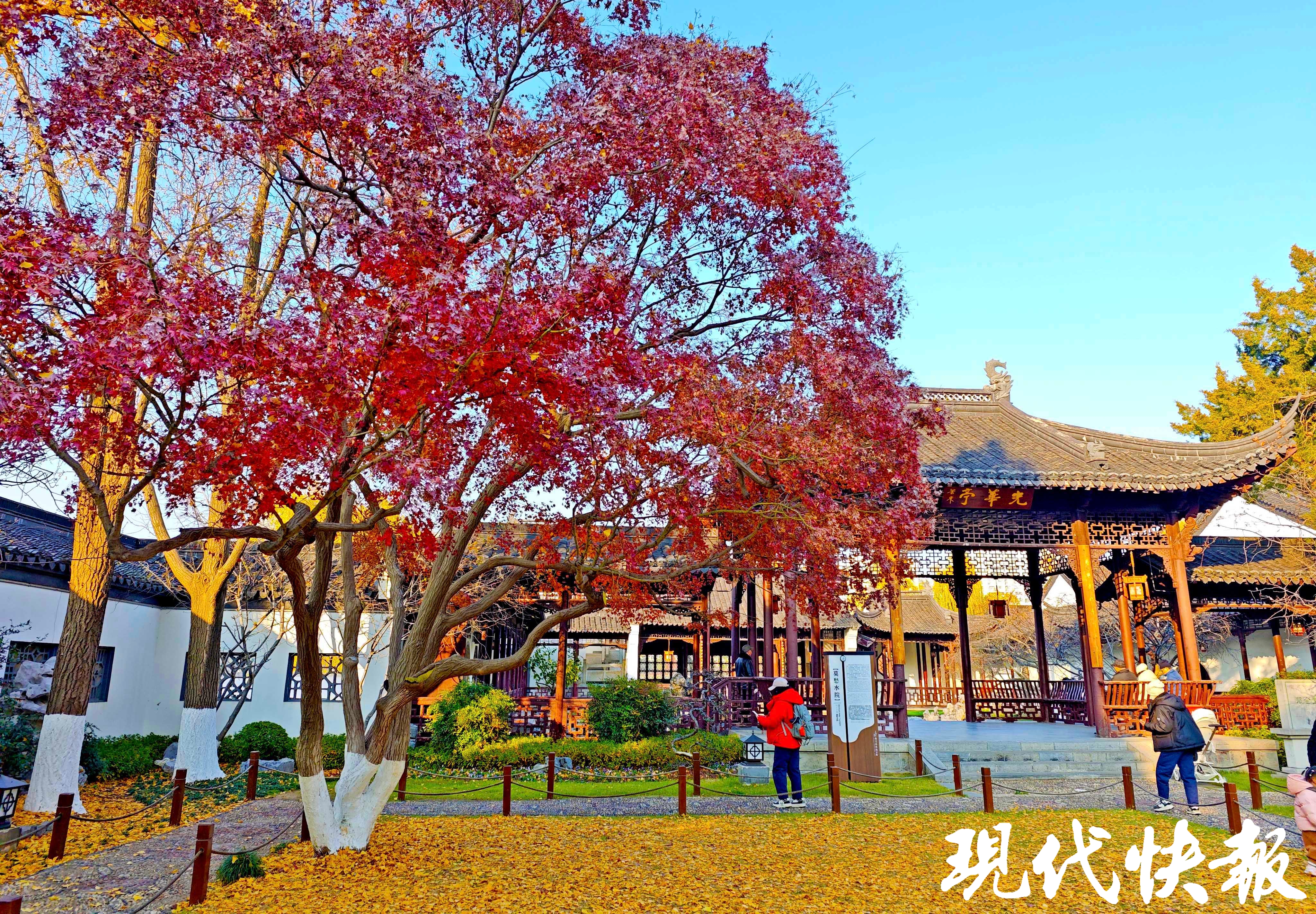 12月的南京,莫愁湖公园内,莫愁水院前的鸡爪槭一片火红,与古典风格的建筑相得益彰,呈现出一幅初冬美好园林画卷。