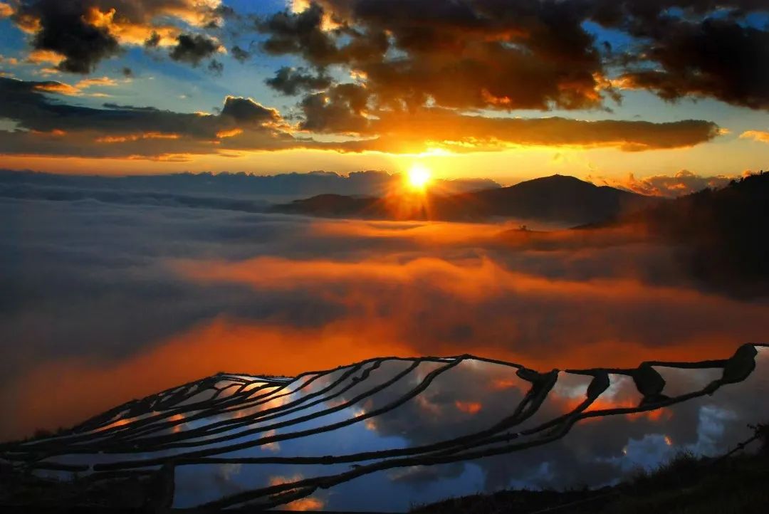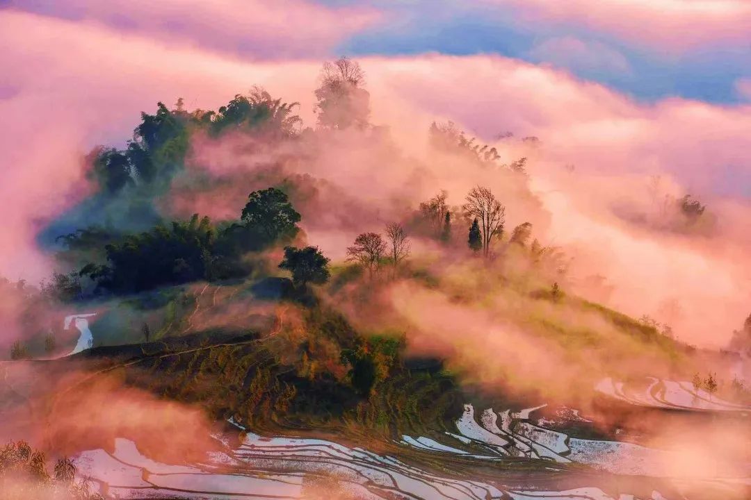 当梯田与云海相会,奔腾的云海与错落有致的梯田相依相偎,一动一静间,变化万千,日出霞红之时,更加奇幻夺目。