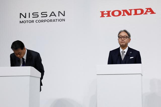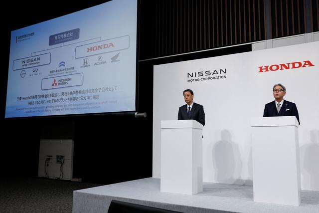 12月23日,日产汽车公司社长内田诚(左)和本田汽车公司社长三部敏宏在日本首都东京出席记者会。新华社/路透