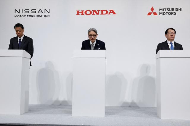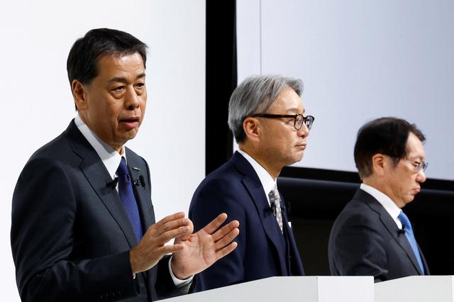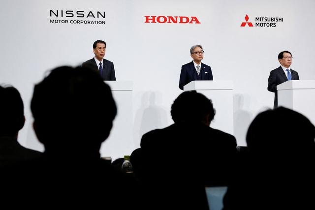 12月23日,日产汽车公司社长内田诚(左)、本田汽车公司社长三部敏宏(中)和三菱汽车公司社长加藤隆雄在日本首都东京共同出席记者会。新华社/路透
