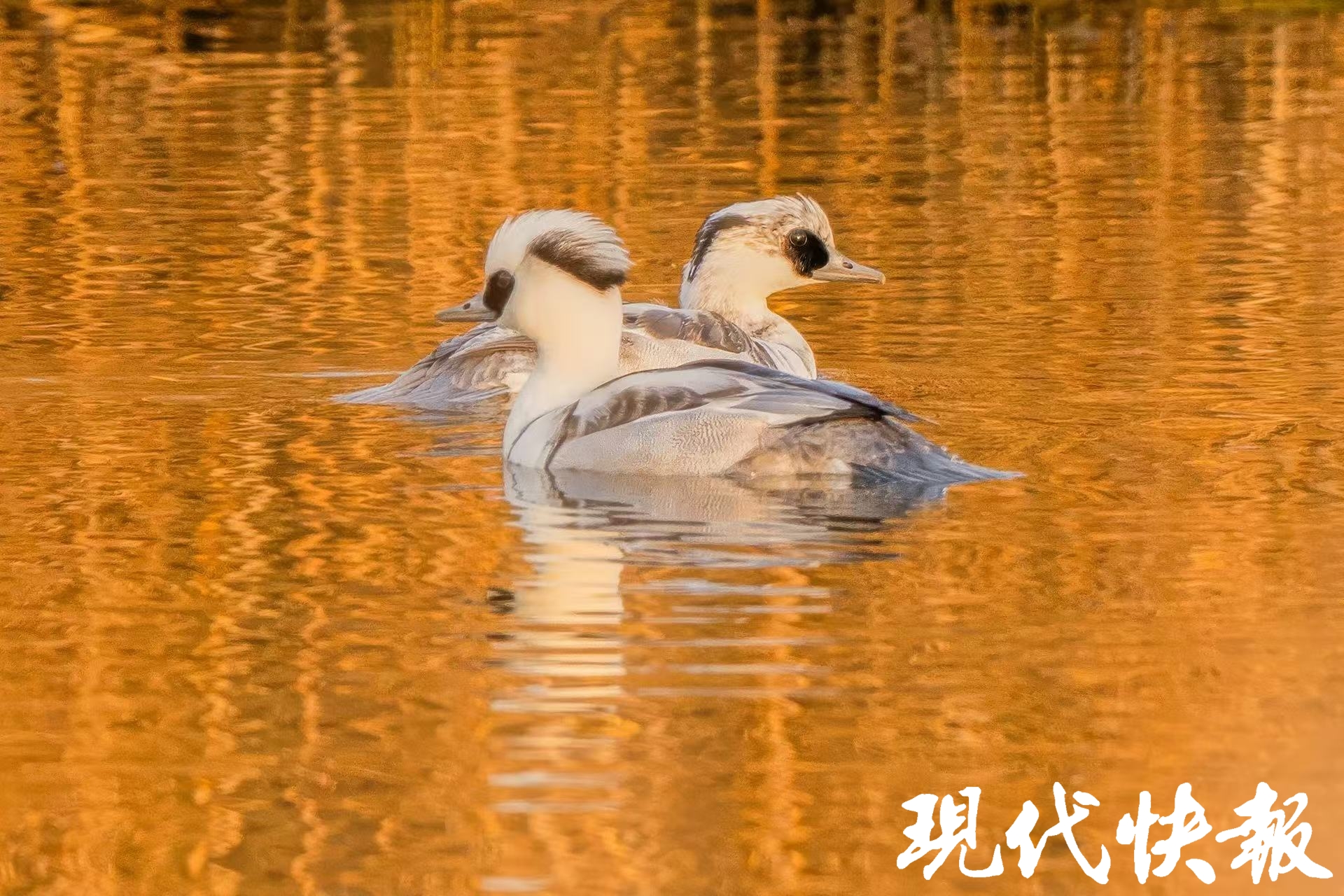 现代快报记者了解到,白秋沙鸭学名斑头秋沙鸭,雄鸟体羽以黑白色为主,眼睛四周为黑色,酷似熊猫眼,因而被称为“熊猫鸭”。雌鸟及非繁殖期雄鸟上体灰色,具两道白色翼斑,下体白,眼周近黑,额、顶及枕部栗色。与普通秋沙鸭的区别在于喉白色。