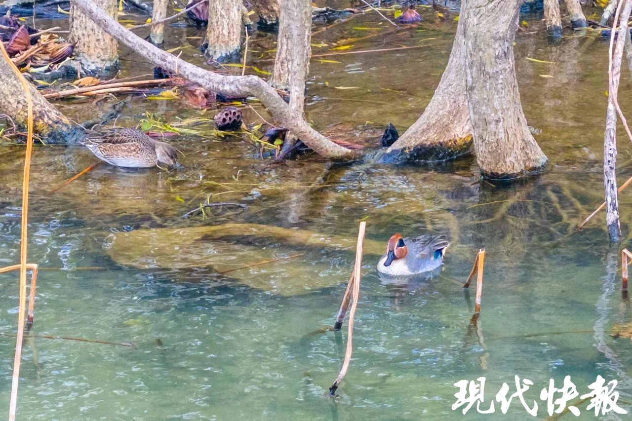 从景区工作人员拍摄的照片中可以看到,绿翅鸭体形较小,在枯荷间自在地游弋、觅食。雄鸭和雌鸭长得非常不同,雄鸭头部和颈部呈深栗色,两侧从眼到颈后各有一条宽阔的绿色带斑,极为醒目。雌鸭则相对暗淡,呈暗褐色和白色。