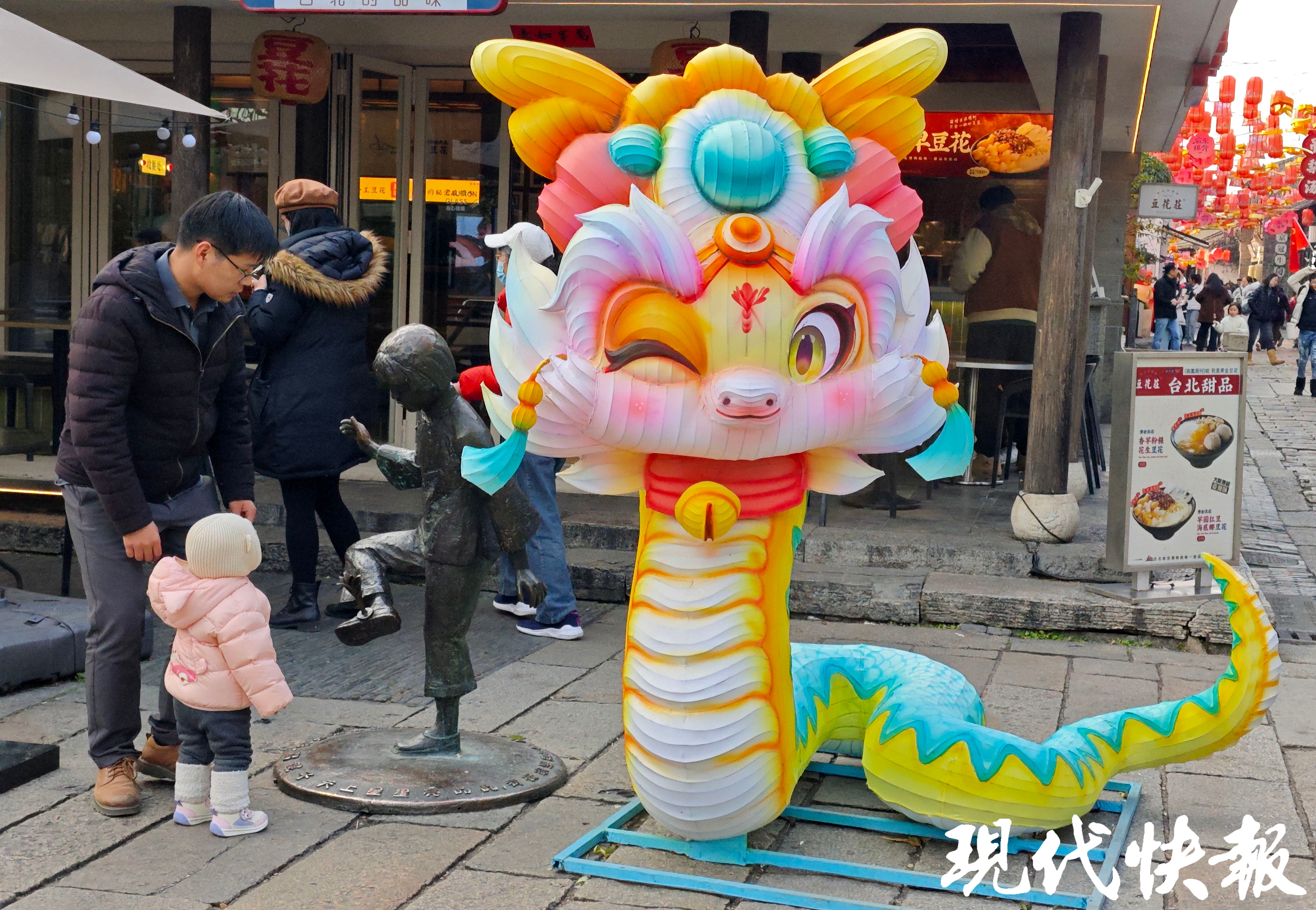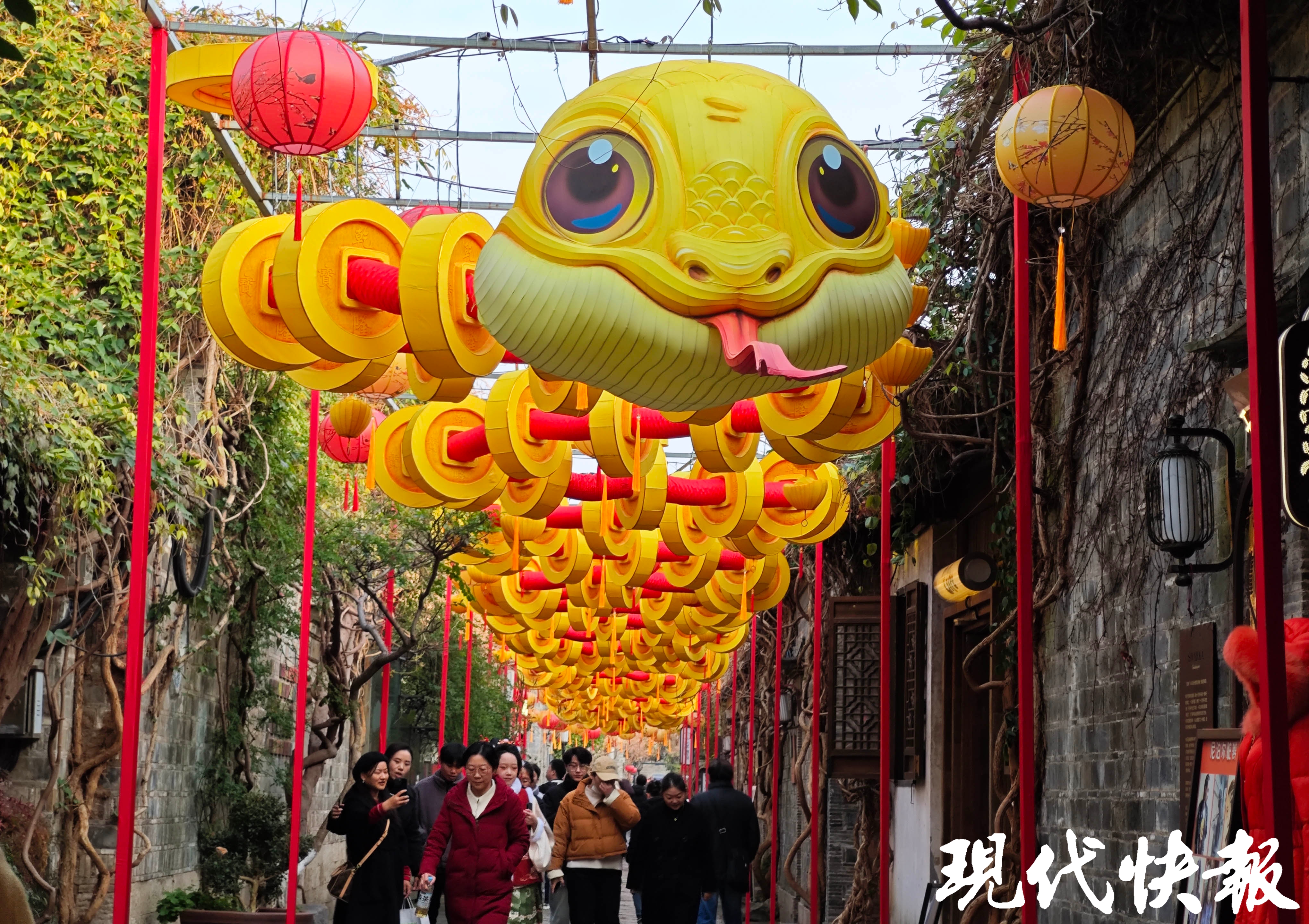 12月25日,现代快报记者探访南京老门东发现,一组组蛇年花灯已组装完毕。wink蛇、粉蛇、吐舌头蛇,还有80米长的“金蛇送财”彩灯……老门东街区年味十足。