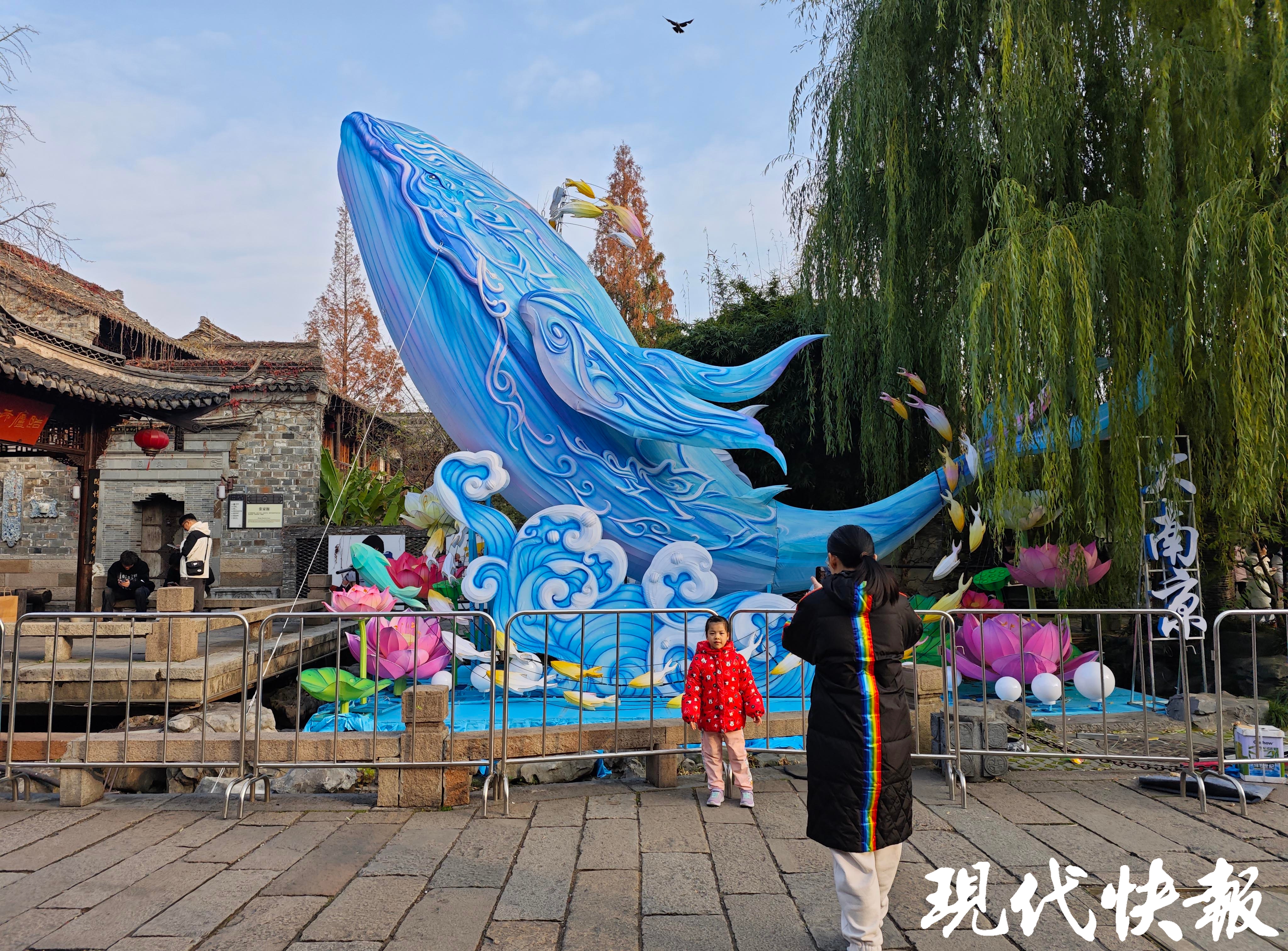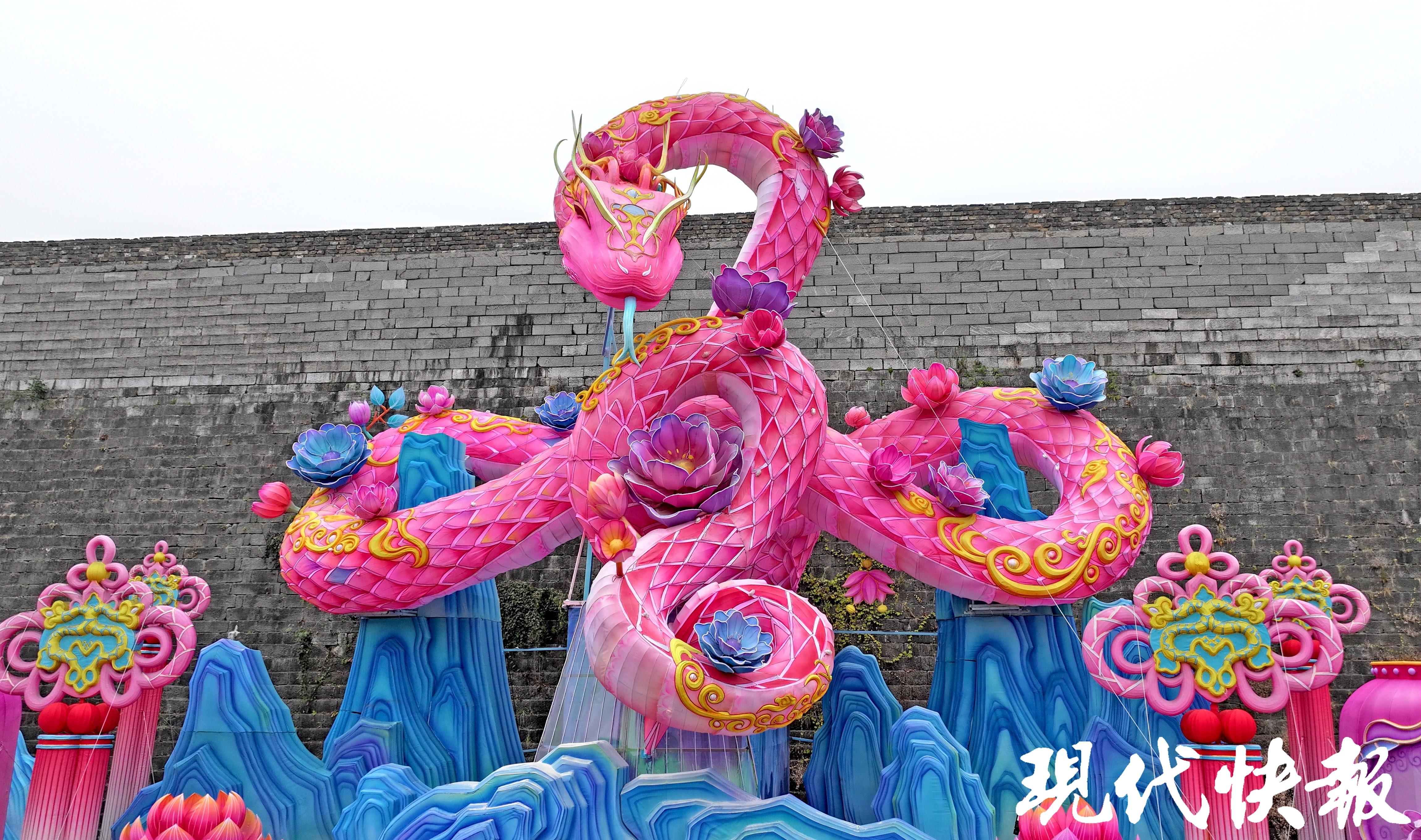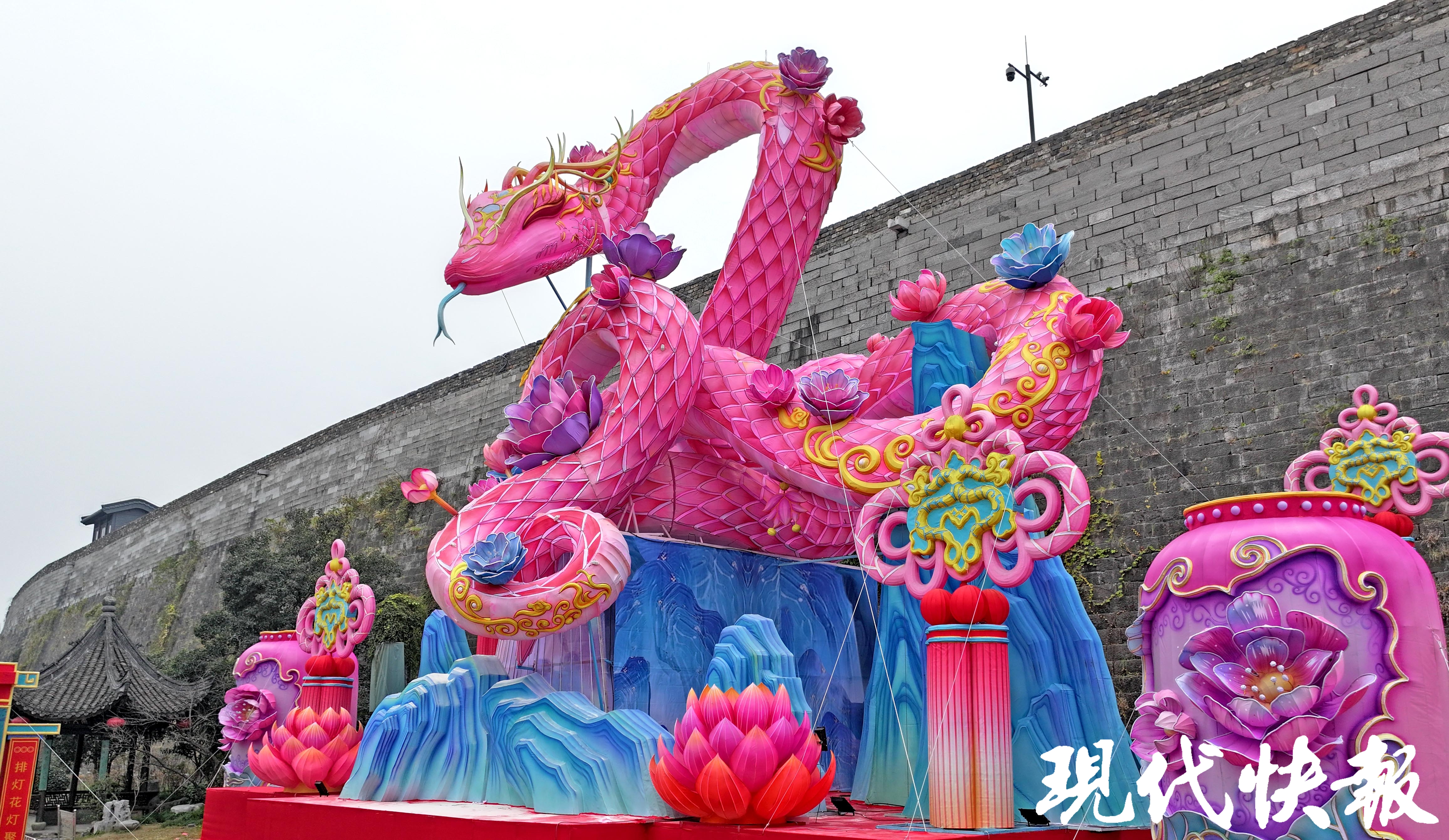 最受关注的老门东城墙下巨型生肖蛇灯,长约22米,高约14米,是历年来老门东主灯最大的一个。蛇身为盘旋的“中国结”造型,身上点缀“荷花灯”,预计在元旦之前亮灯。