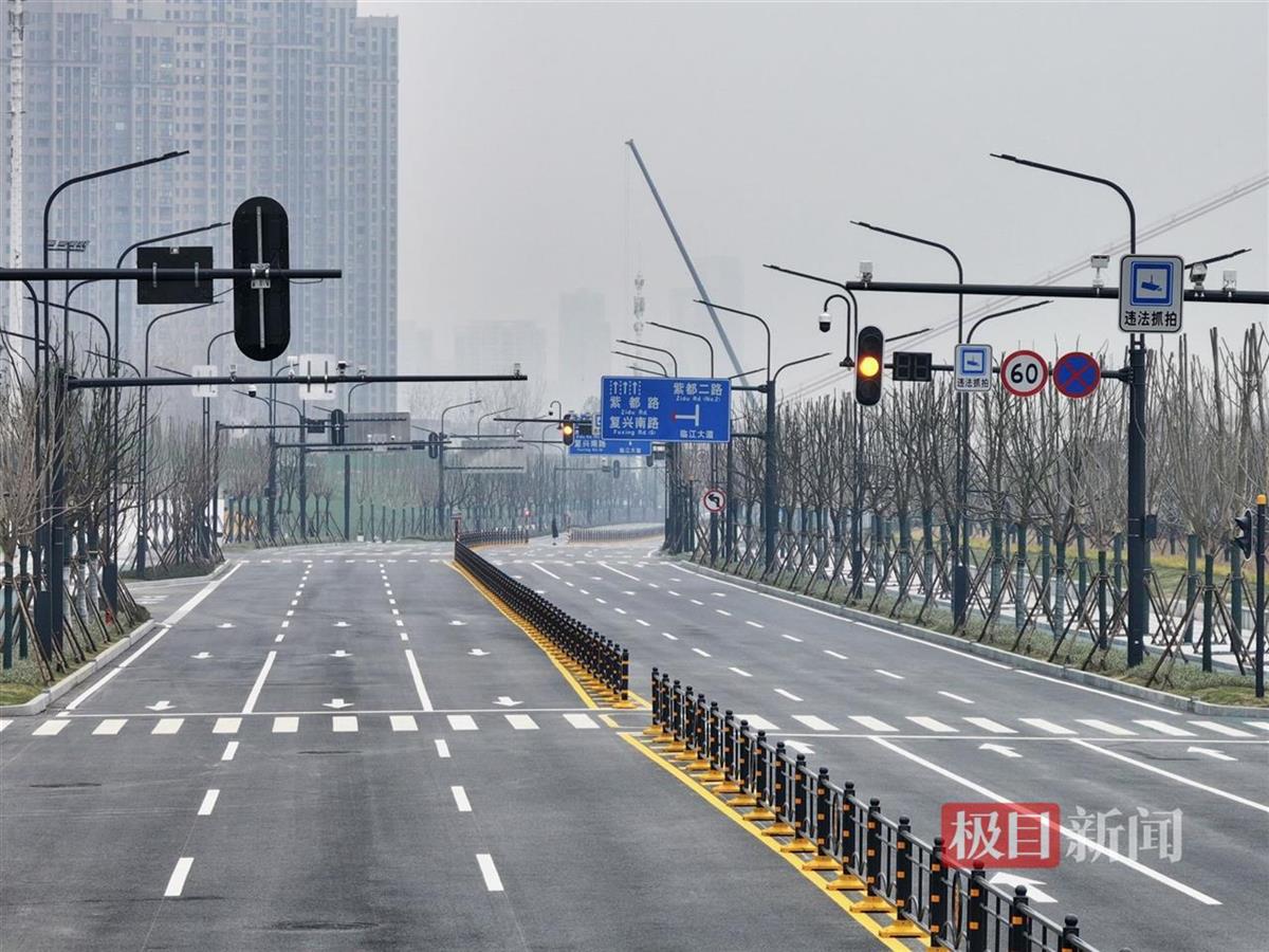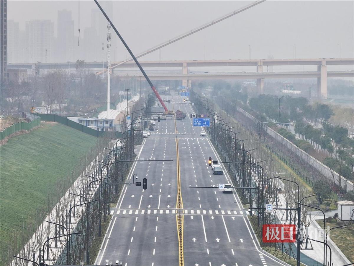 12月26日,俯瞰武汉右岸大道南段(江安路至八坦路),双向六车道的路面已经刷黑,路灯及交通信号设施也已安装到位。