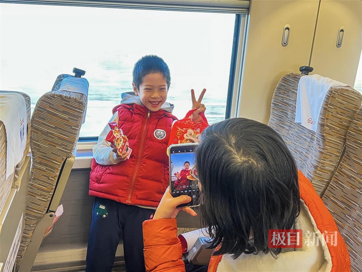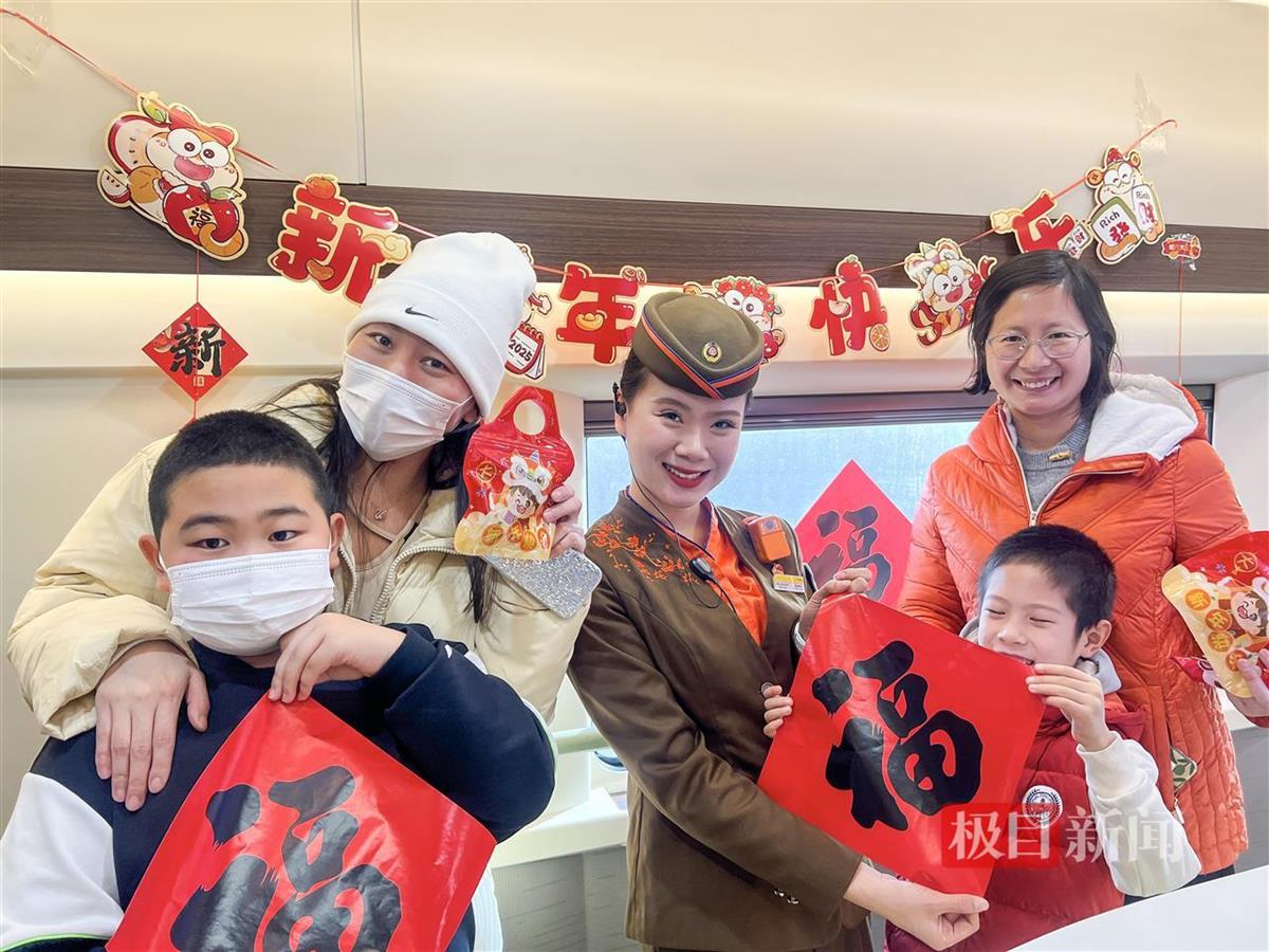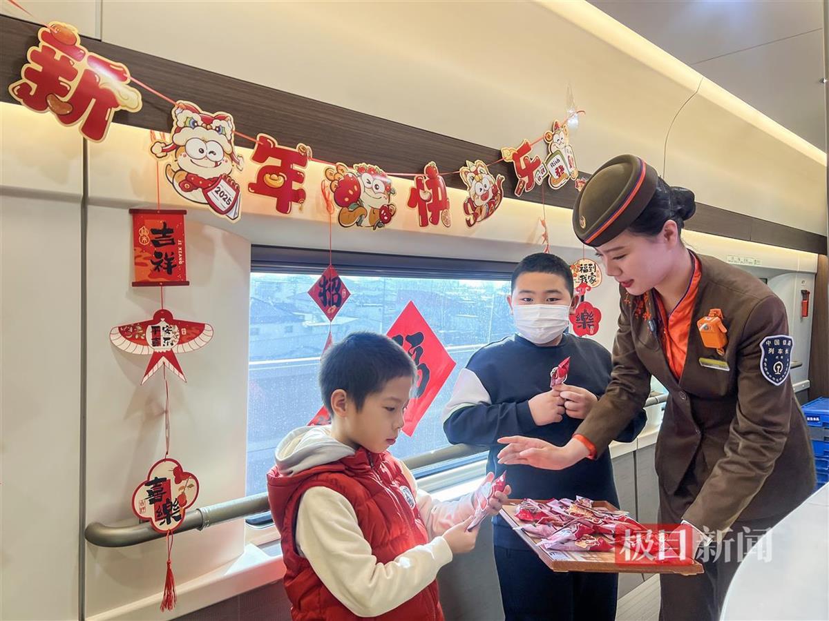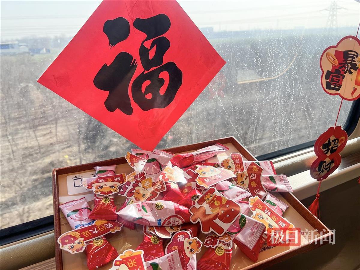 列车长饶雅玲作为团员青年代表,为旅客朋友们准备了各种带有“祝福”的棒棒糖,和小朋友一起将“福”字贴在窗户上,既让旅客感觉到了温暖,也拉近了工作人员与旅客的距离。团员青年乘务员安茹芸带着蛇年特色窗花、福字走进车厢,热情邀请旅客共迎新年。一对母女率先响应,女孩兴奋地挑选出带有俏皮小蛇的窗花,母亲微笑着陪在一旁。安茹芸耐心指导,边帮女孩贴窗花,边讲述蛇年故事。很快,车窗上贴满精美窗花,车厢内年味儿十足。母女俩手持未贴完的小蛇窗花,笑得格外灿烂。列车载着众人对蛇年的期盼,飞速向前。