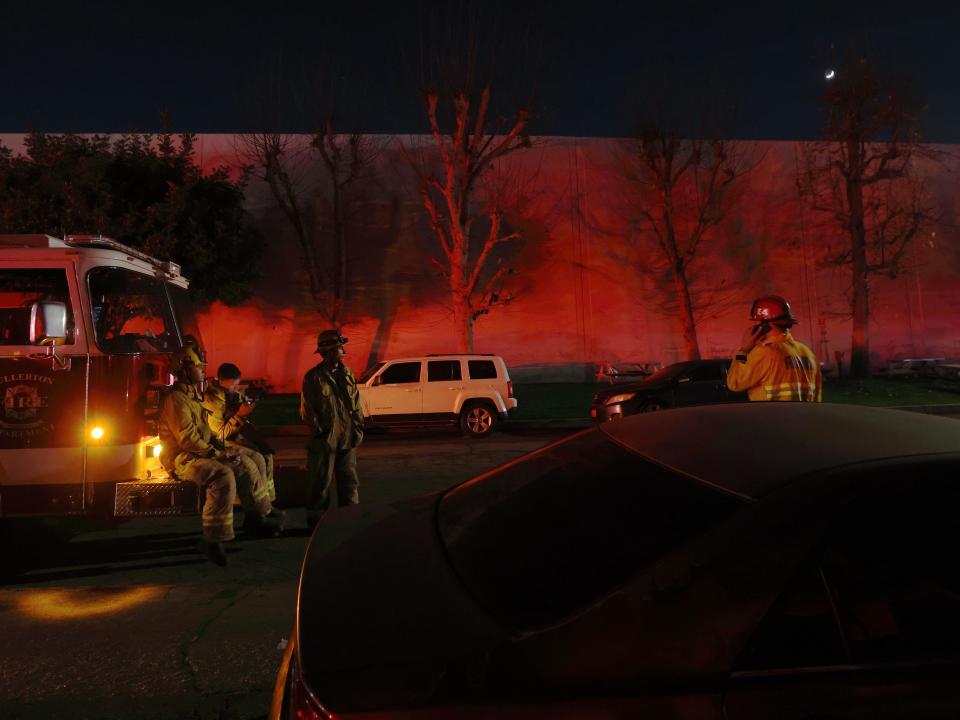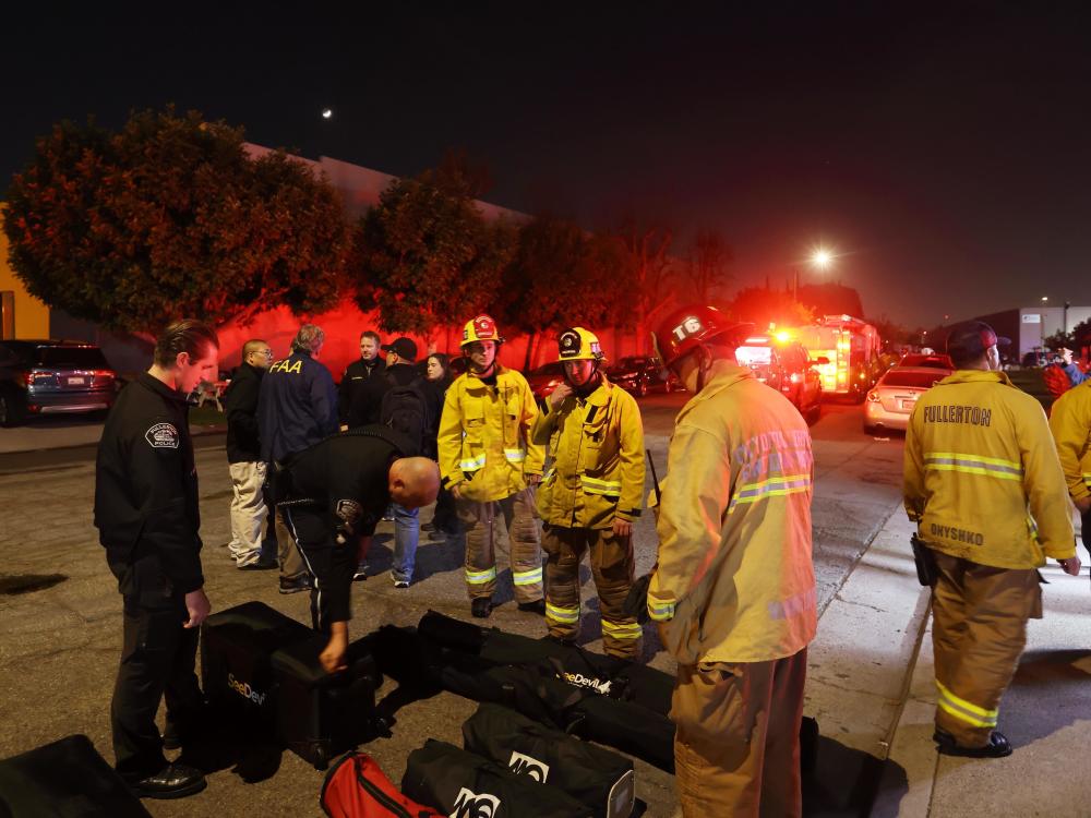 1月2日,消防员在美国富勒顿市被飞机撞上的建筑物旁待命。新华社发(邱晨 摄)