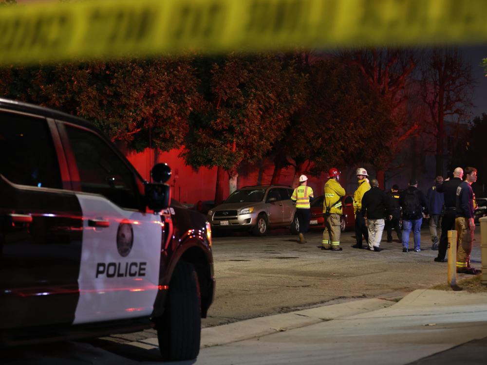 1月2日,消防员和警察在美国富勒顿市被飞机撞上的建筑物旁工作。新华社发(邱晨 摄)