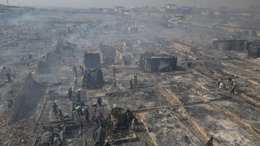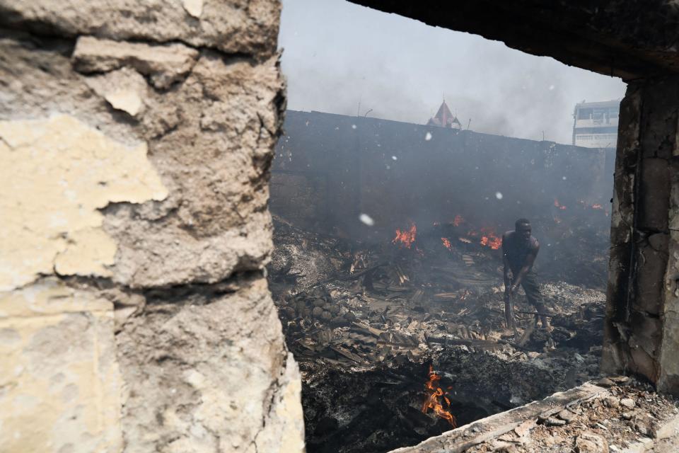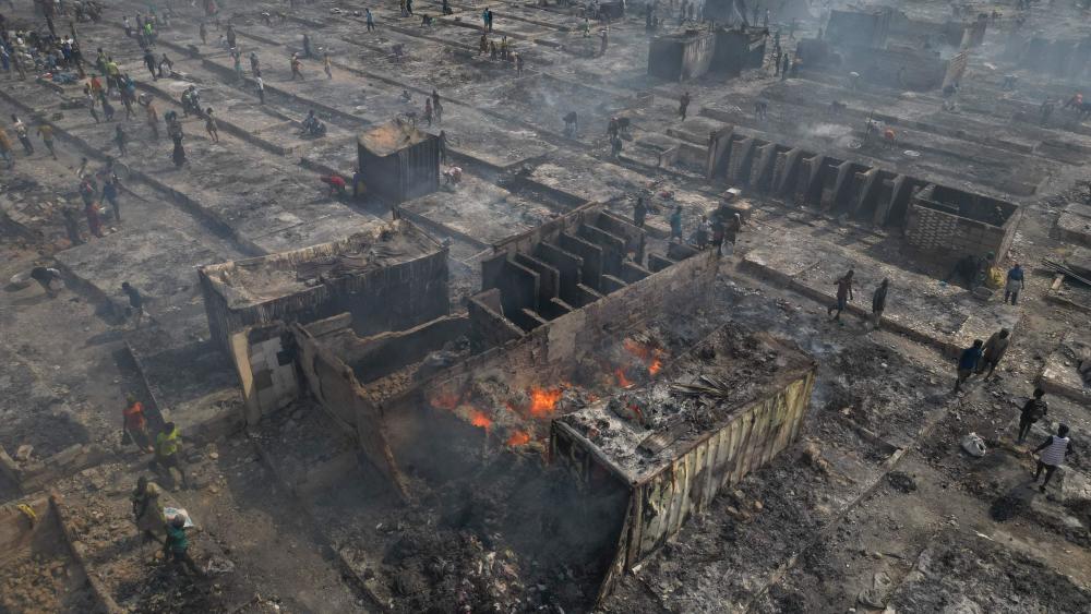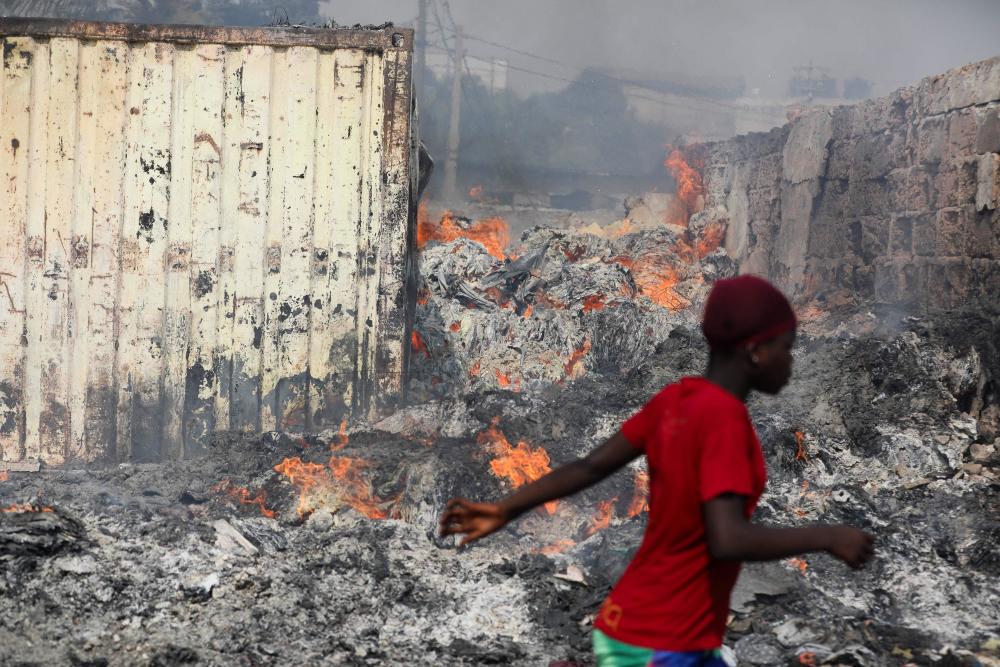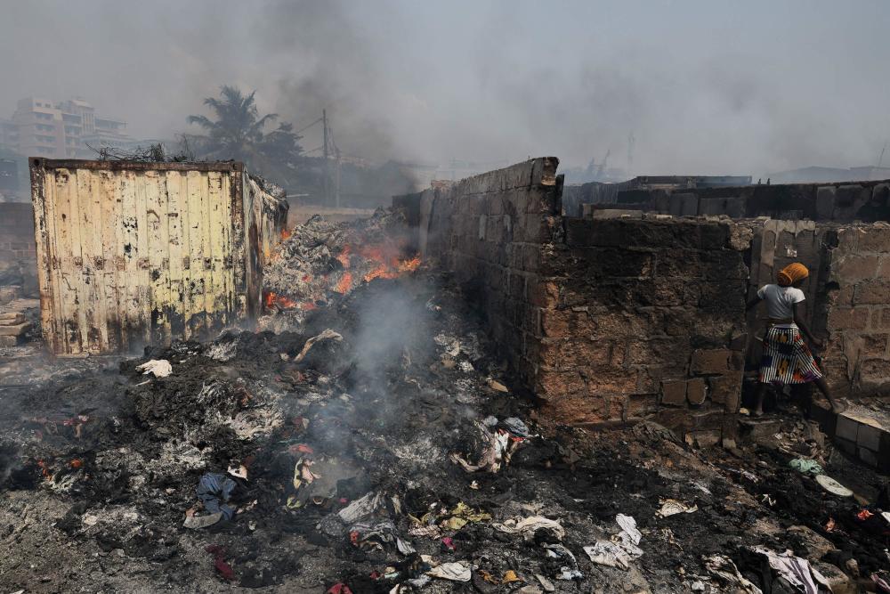 1月2日,在加纳阿克拉一个发生火灾的二手服装市场,火势尚未完全扑灭。新华社/法新