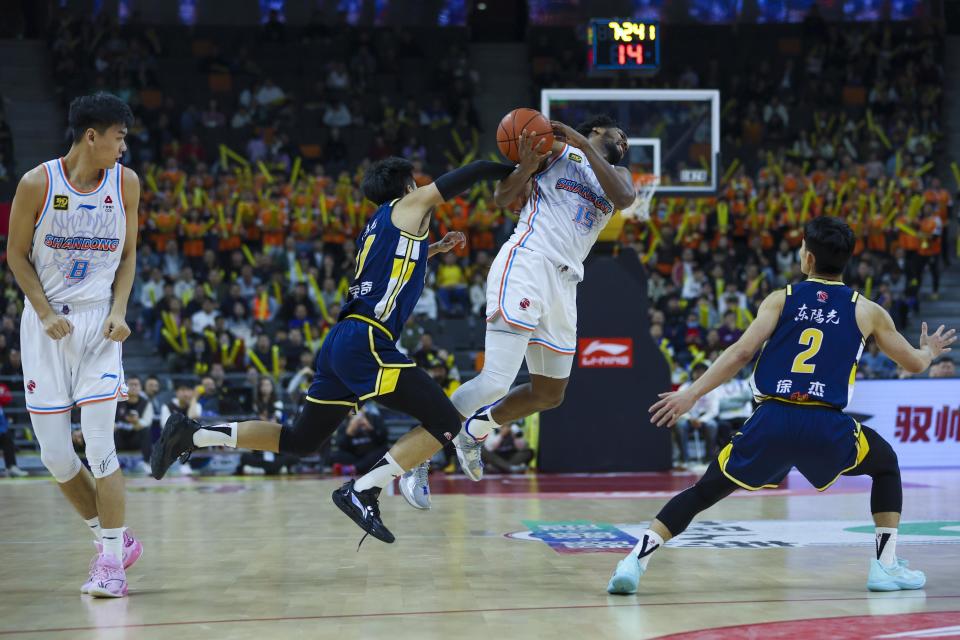 1月4日,山东高速队球员克里斯(中)与广东东阳光队球员徐杰(右)在比赛中拼抢。新华社发(郑家雄摄)