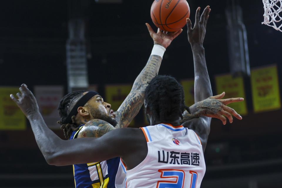 1月4日,广东东阳光队球员莫兰德(左)在比赛中与山东高速队球员摩尔争抢。新华社发(郑家雄摄)