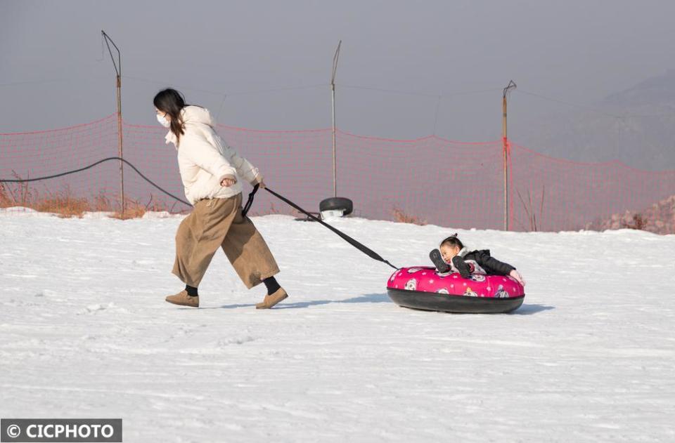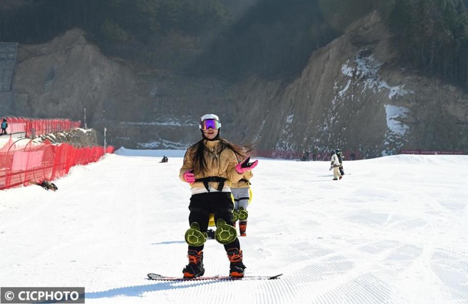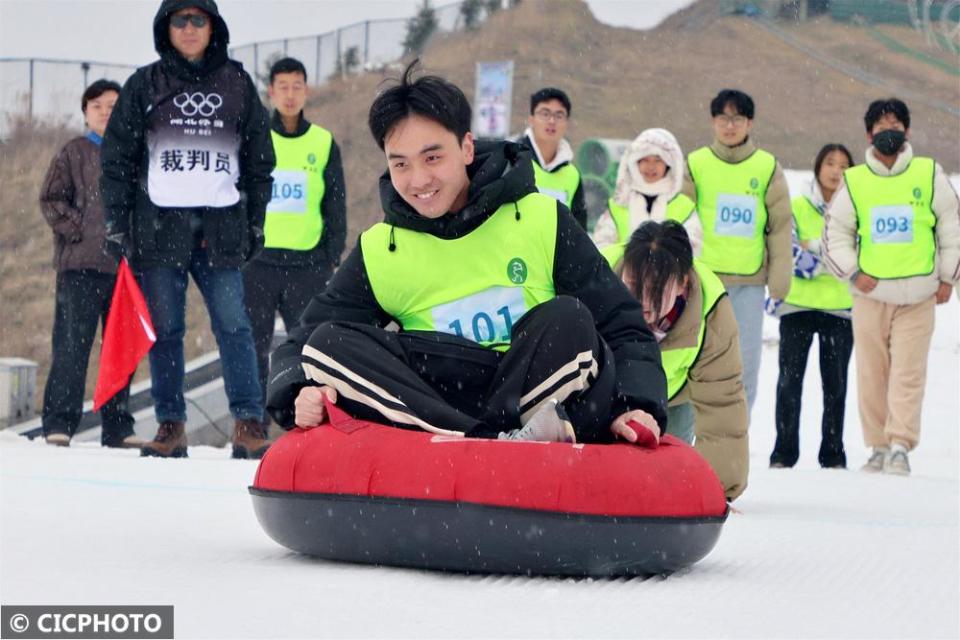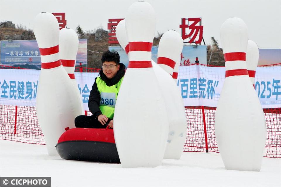 ↑2025年1月4日,游客在湖北省宜昌市夷陵区百里荒滑雪场参加冰雪趣味运动“雪地划行”比赛。CICPHOTO/张国荣 摄