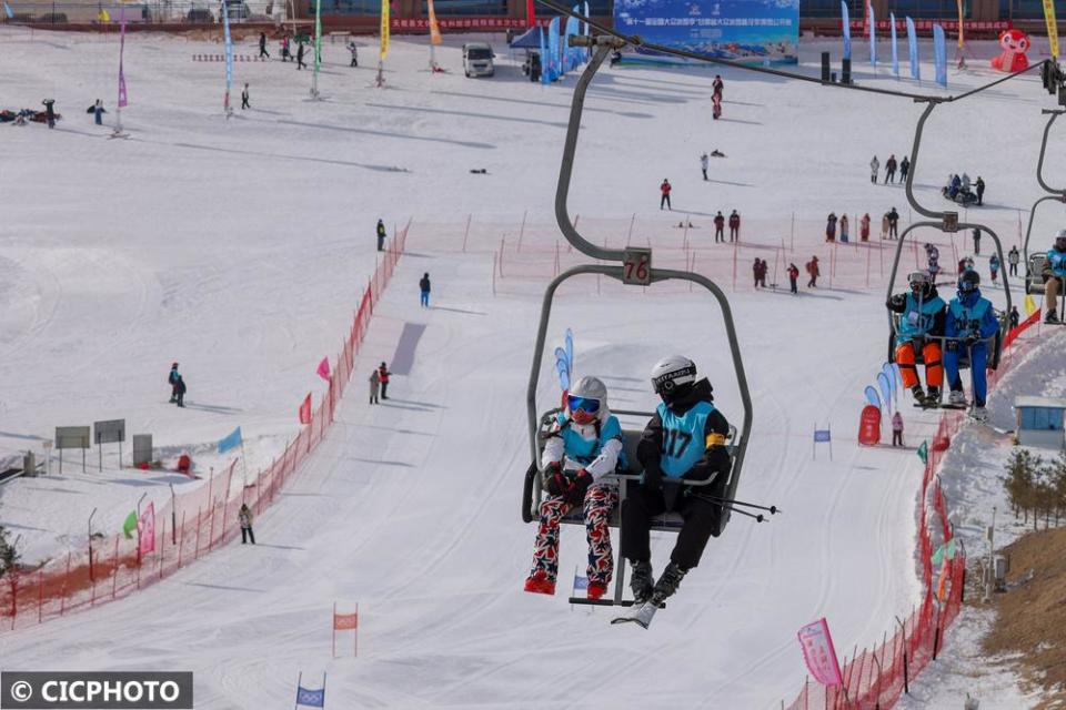 ↑2025年1月4日,在甘肃省武威市天祝藏族自治县乌鞘岭国际滑雪场,运动员坐缆车到山顶参加比赛。CICPHOTO/王守辉 摄