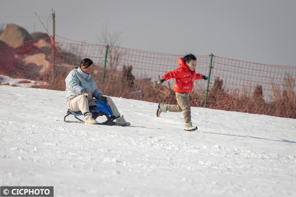 ↑2025年1月5日,山东枣庄滕州市莲青山滑雪场,孩子在家长的陪伴下滑雪。CICPHOTO/彭慧英 摄
