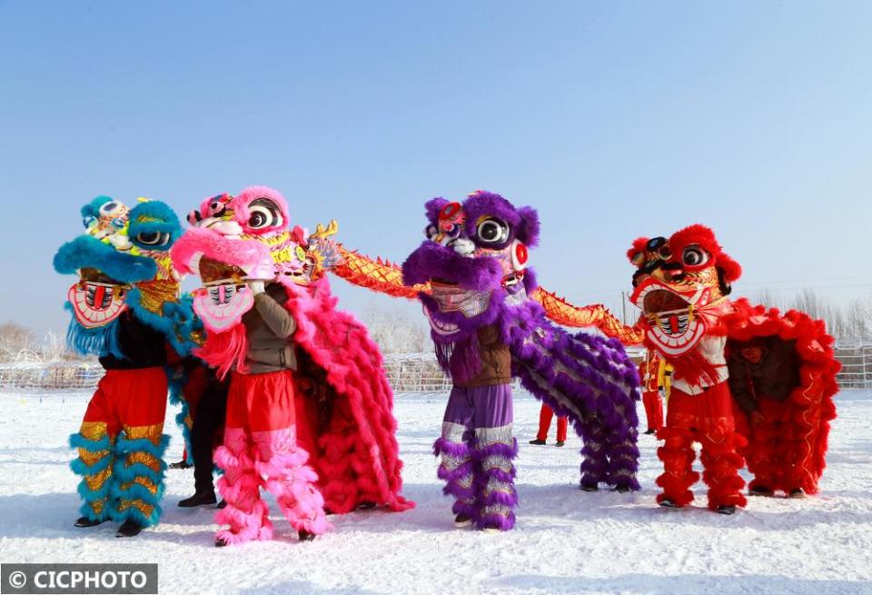 ↑2025年1月1日,在新疆阿克苏地区阿瓦提县塔木托格拉克镇吐格贝希村滑雪场,村民在表演舞狮。CICPHOTO/包良廷 摄