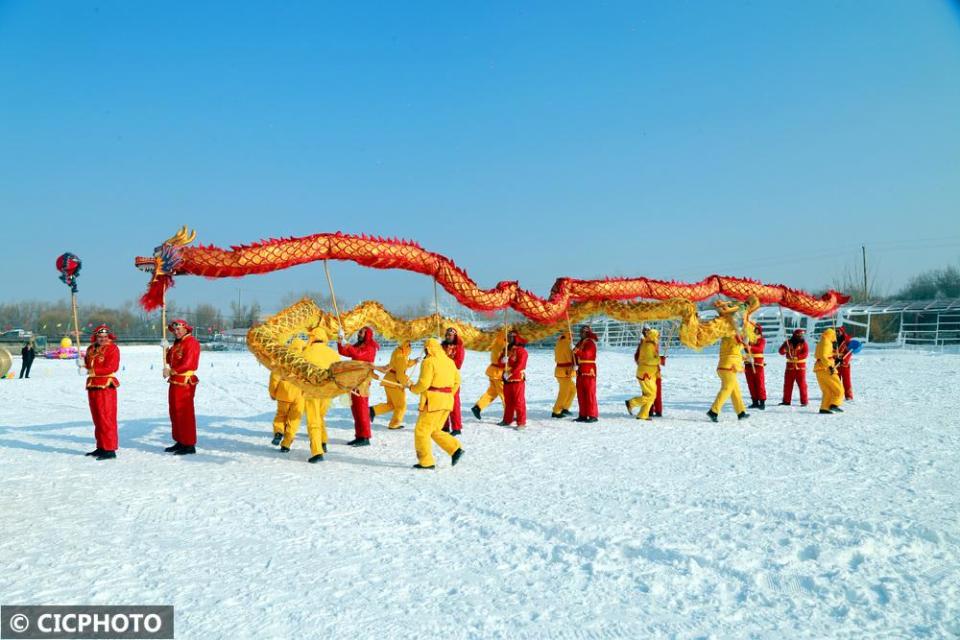 ↑2025年1月1日,在新疆阿克苏地区阿瓦提县塔木托格拉克镇吐格贝希村滑雪场,村民在表演舞龙。CICPHOTO/包良廷 摄