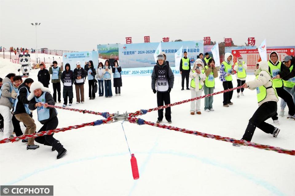 ↑2025年1月4日,游客在湖北省宜昌市夷陵区百里荒滑雪场参加冰雪趣味运动“雪地拔河”比赛。CICPHOTO/张国荣 摄