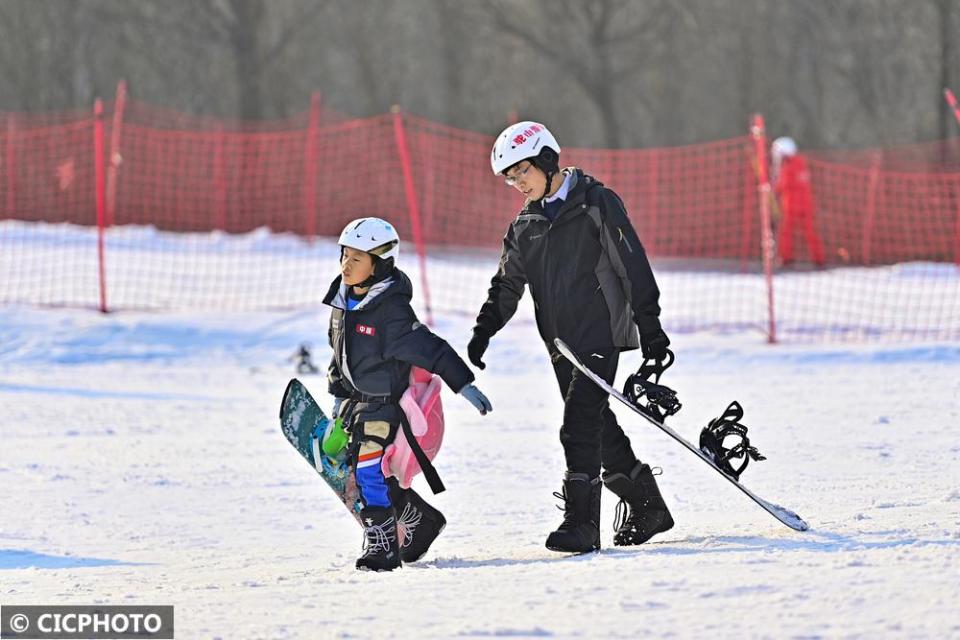 ↑2025年1月1日,一对父子手持滑雪板进入山东省青州市驼山滑雪场。CICPHOTO/王继林 摄