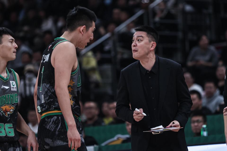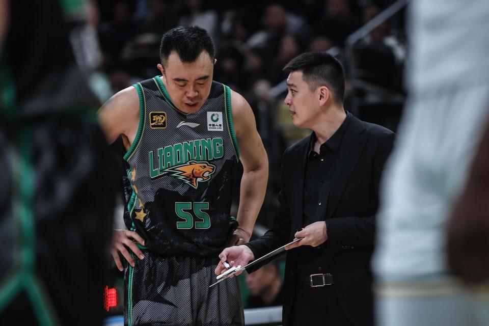 1月6日,辽宁本钢队主教练杨鸣(右)在比赛中与球员付豪(中)交流。新华社记者 潘昱龙 摄