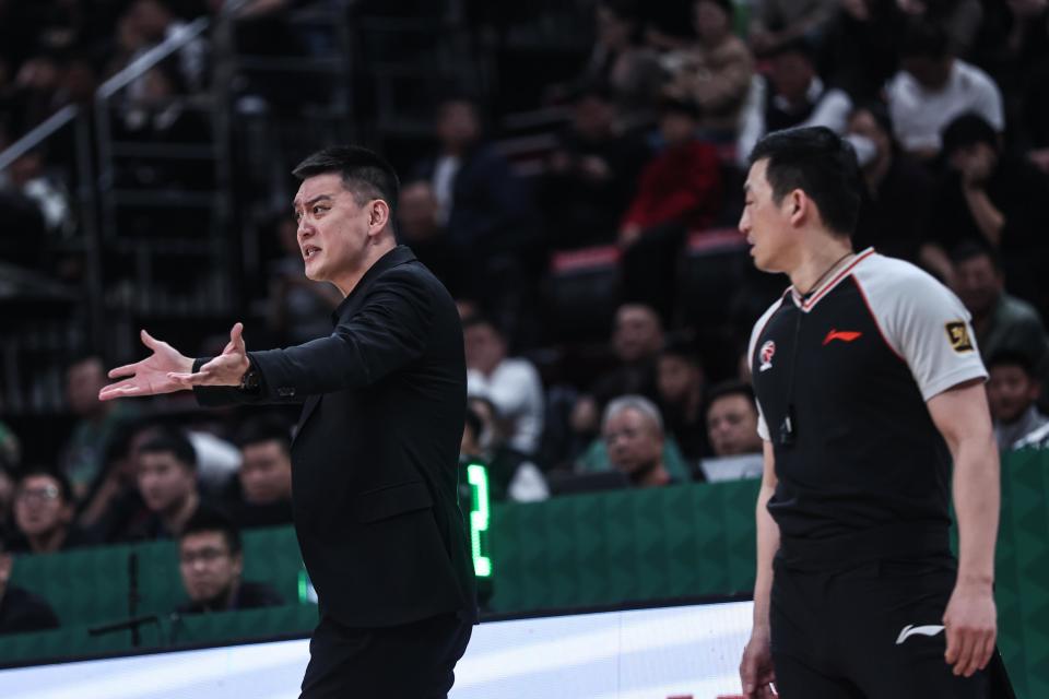 1月6日,辽宁本钢队主教练杨鸣(左)对判罚提出质疑。新华社记者 潘昱龙 摄
