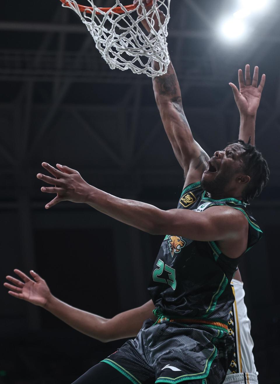 1月6日,辽宁本钢队球员帕顿(前)在比赛中扣篮。新华社记者 潘昱龙 摄