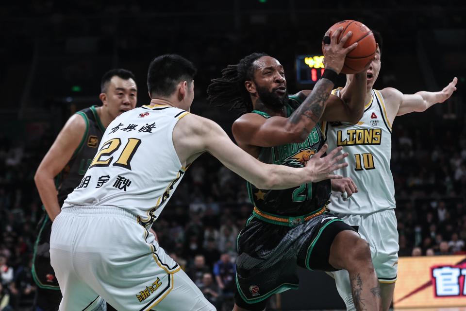 1月6日,辽宁本钢队球员威尔斯(右二)在比赛中进攻。新华社记者 潘昱龙 摄