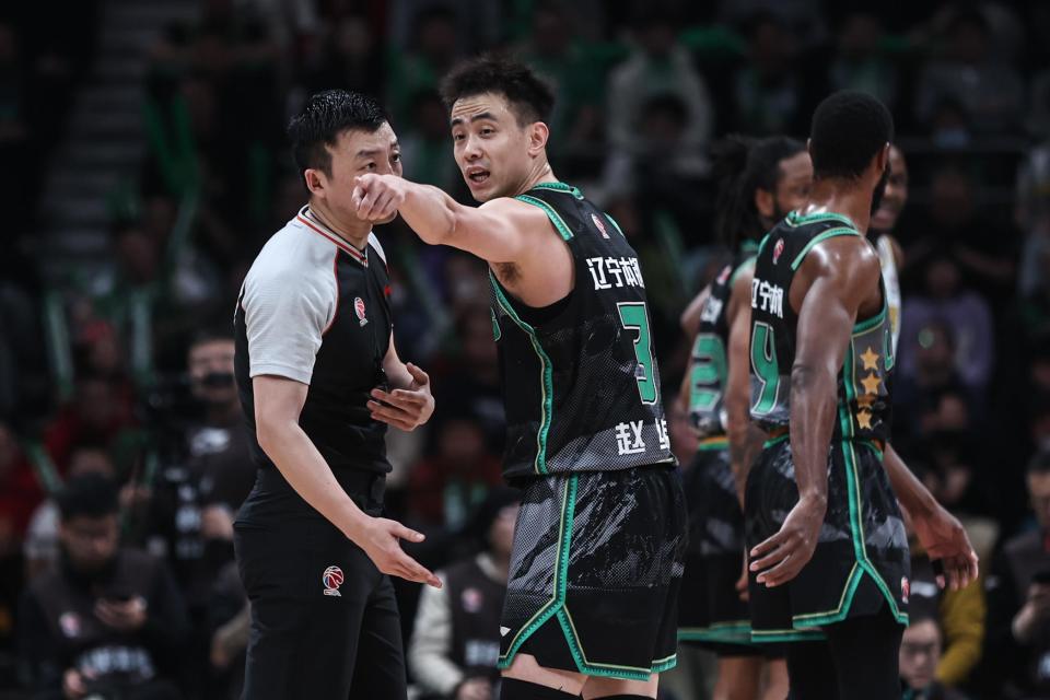 1月6日,辽宁本钢队球员赵继伟(左二)在比赛中与裁判交流。新华社记者 潘昱龙 摄