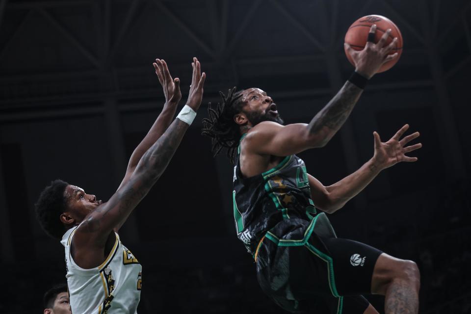 1月6日,辽宁本钢队球员威尔斯(右)在比赛中上篮。新华社记者 潘昱龙 摄