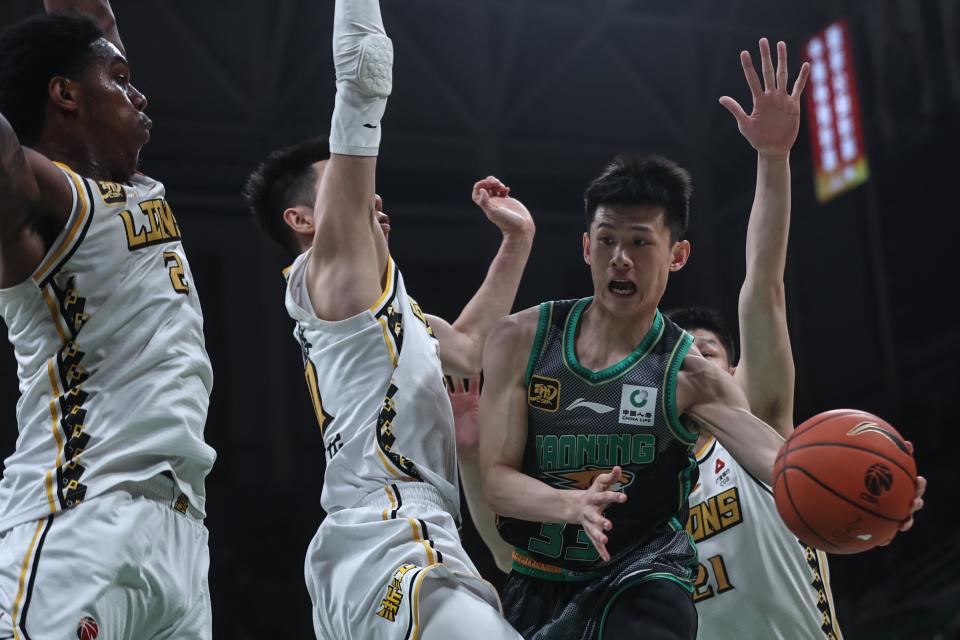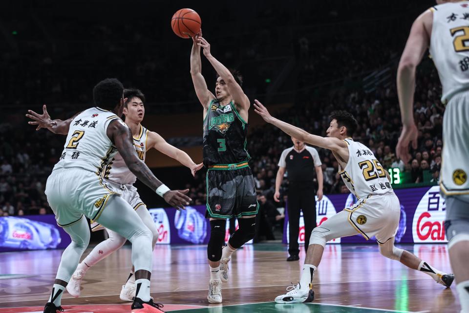 1月6日,辽宁本钢队球员赵继伟(中)在比赛中传球。新华社记者 潘昱龙 摄