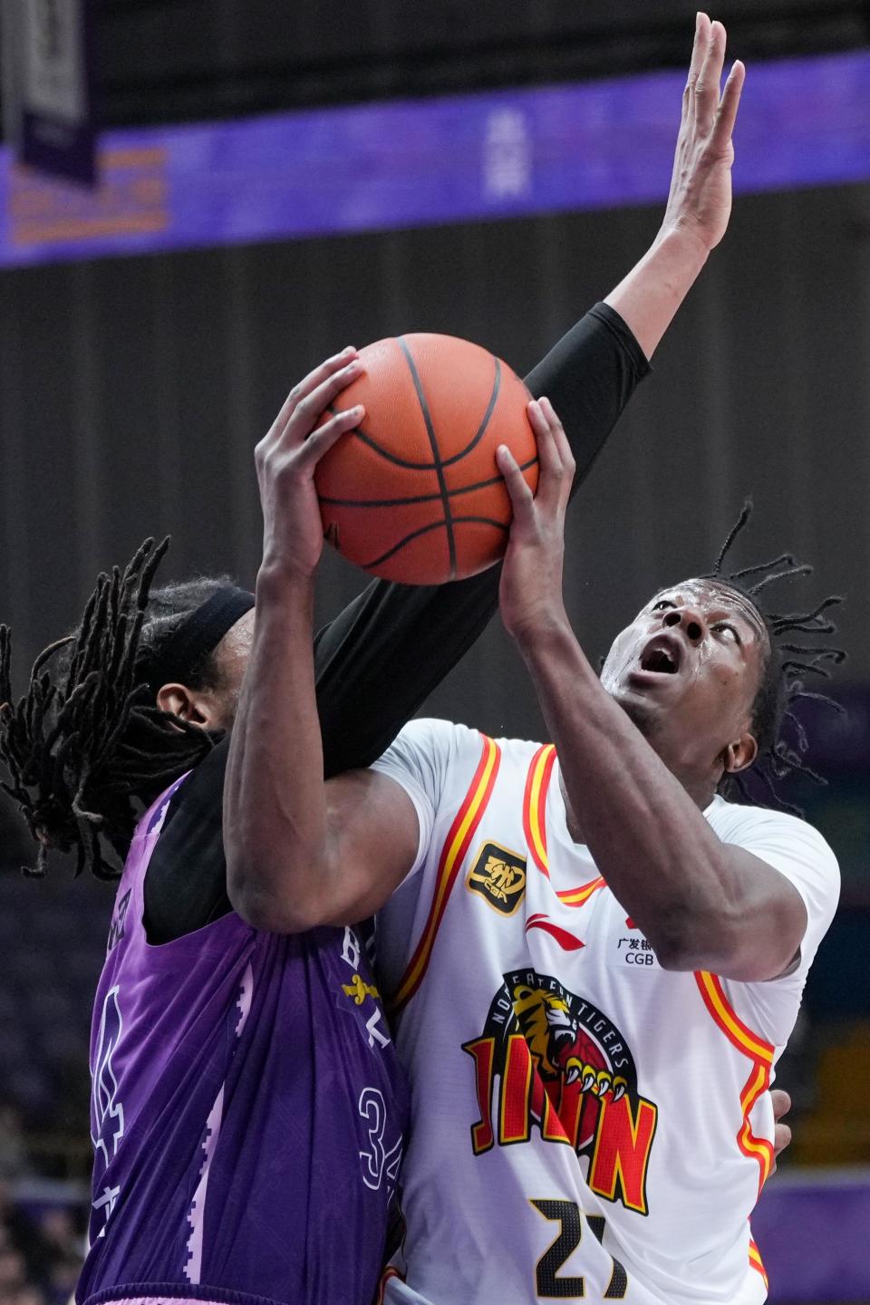1月6日,吉林九台农商银行队球员贾昊(前右)在比赛中与北京控股队球员特莱斯(前左)拼抢。新华社记者 鞠焕宗 摄
