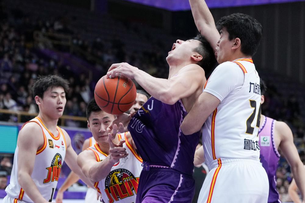 1月6日,吉林九台农商银行队球员鲁吐布拉(右一)在比赛中防守北京控股队球员邹雨宸(右二)的进攻。新华社记者 鞠焕宗 摄
