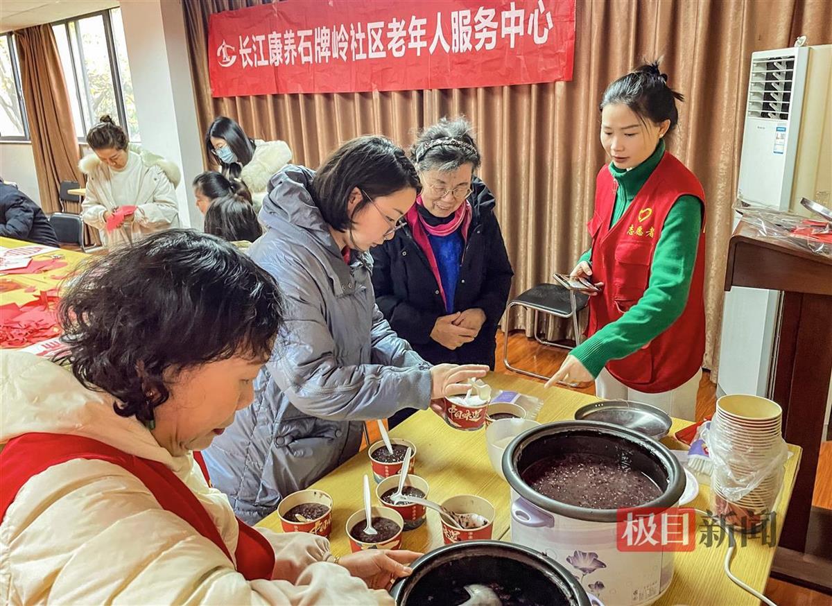 武汉市武昌区中南街石牌岭老人康养中心,工作人员正在给老人分发腊八粥