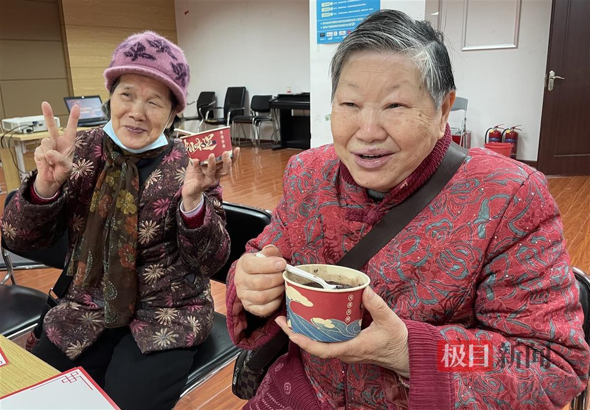 武昌区中南街石牌岭老人康养中心,老人高兴地品尝腊八粥