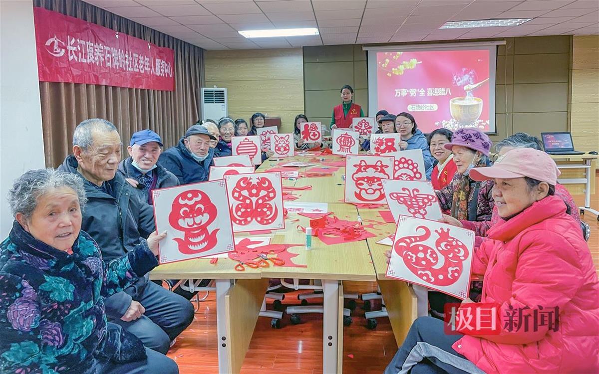 武昌区中南街石牌岭老人康养中心,老人们在一起剪窗花、品腊八粥,高兴度过腊八节