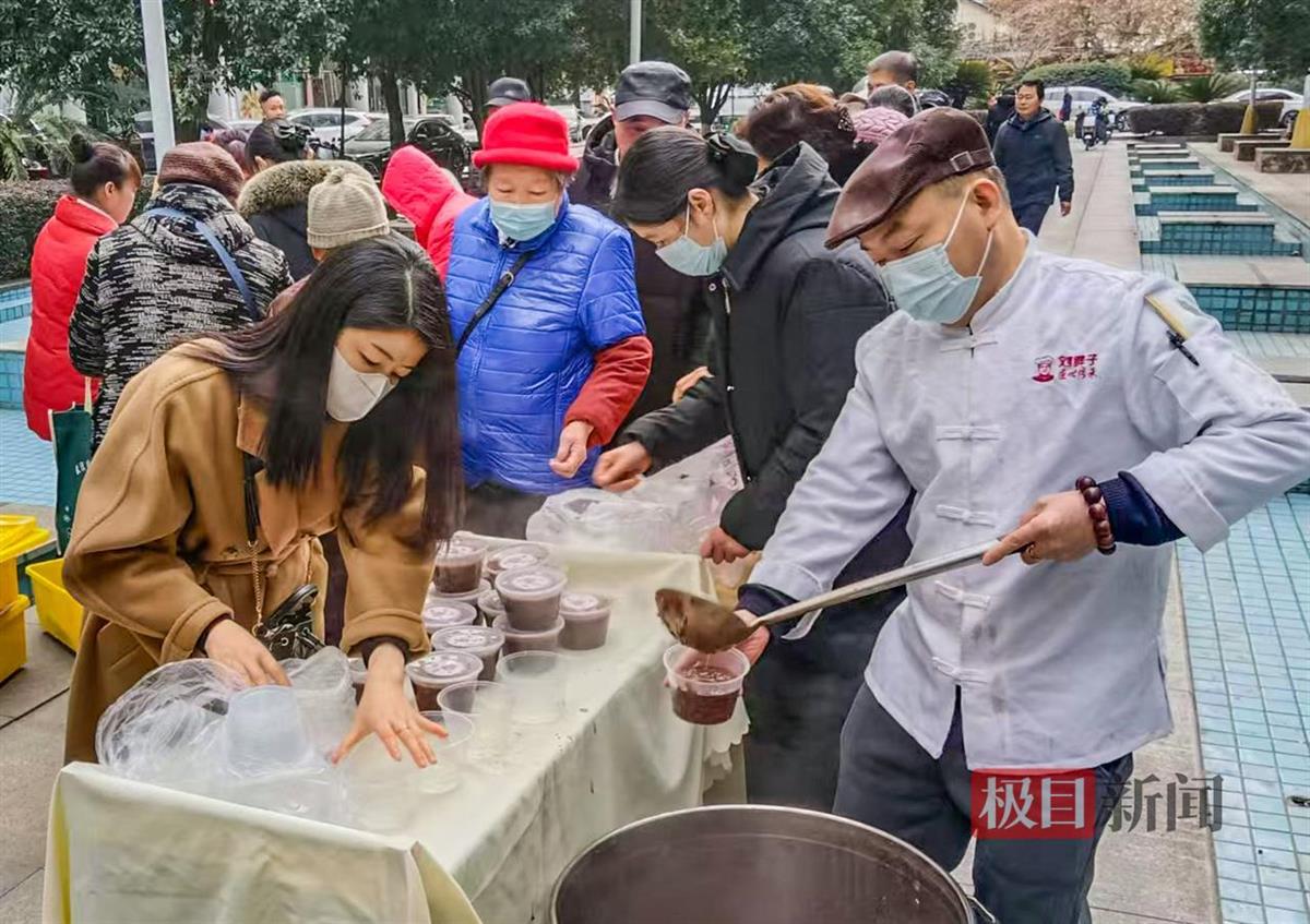 2025年1月7日,武汉市武昌区中南路街道腊八粥飘香,辖区单位、爱心人士等煮好香浓腊八粥,在社区、小区、街头或走进高龄老人家中,送温暖、送祝福,人们高兴地度过腊八节。