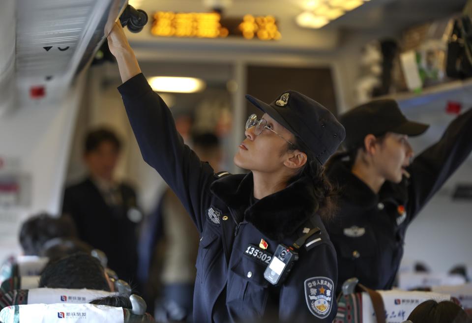 1月8日,在D8816次列车上,“丝路风华”女子乘警组成员马婉钰在列车到达终点站后,仔细检查车厢是否有遗落行李。新华社记者 王菲 摄