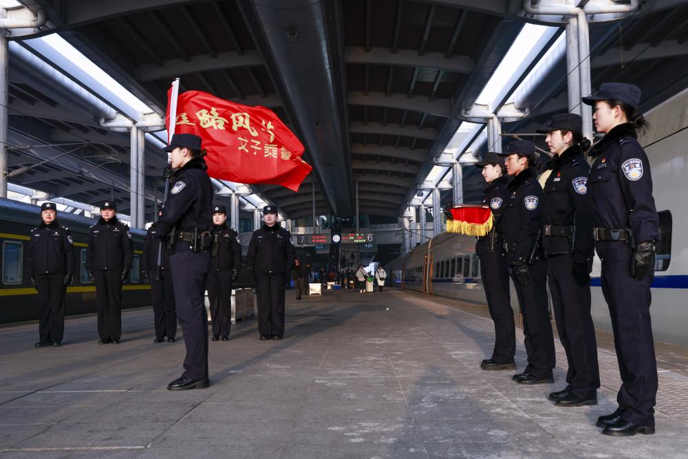 1月8日,在出征仪式上,“丝路风华”女子乘警组挥舞旗帜即将出乘。新华社记者 王菲 摄