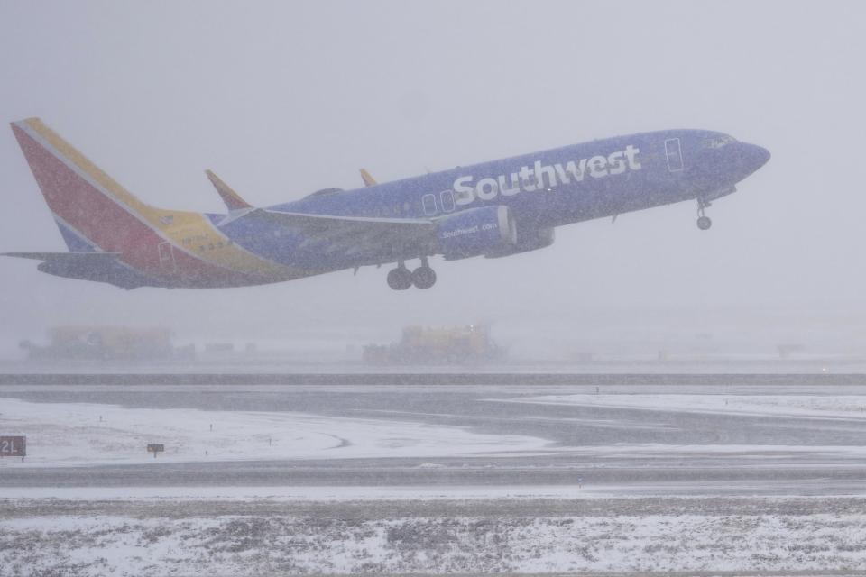 1月10日,在美国田纳西州纳什维尔,一架飞机在雪中起飞。新华社/美联