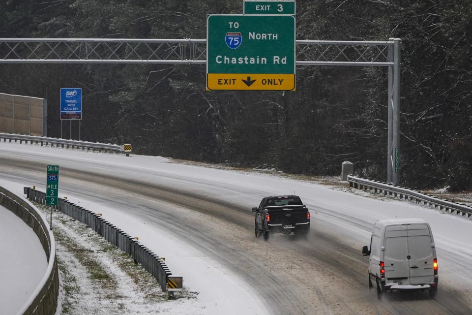 1月10日,在美国佐治亚州肯尼索,车辆在雪中行驶。新华社/美联