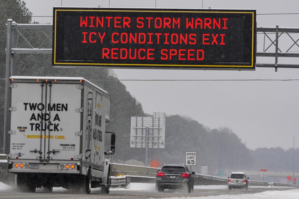 这是1月10日在美国佐治亚州肯尼索拍摄的一块提示过往车辆因道路冰雪需减速慢行的信息显示屏。新华社/美联