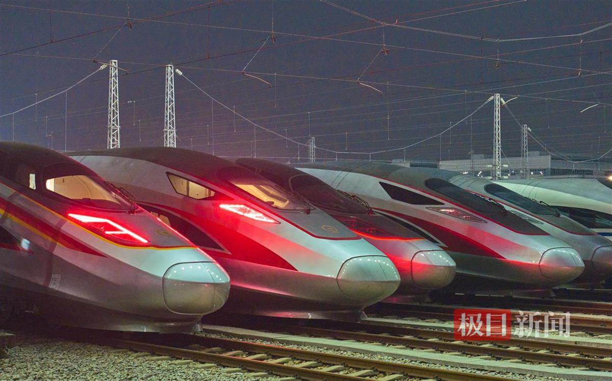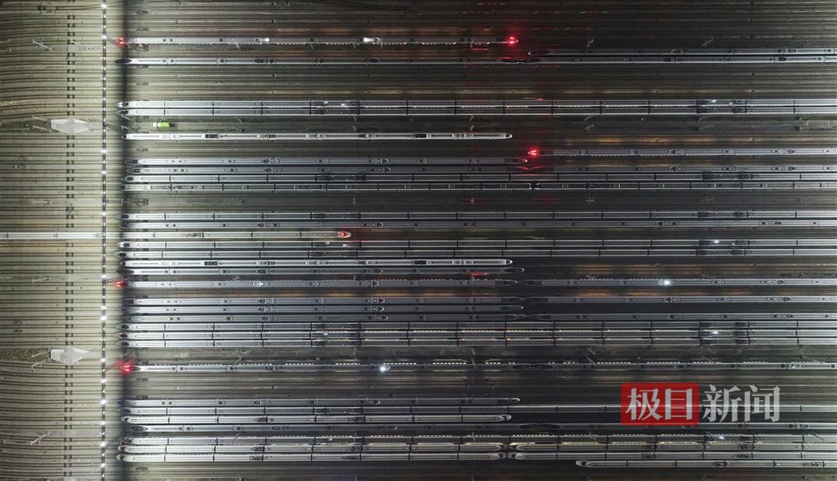 1月14日,春运大幕正式拉开。清晨2时,在武汉动车段存车线上,百余组动车整齐排列,如“陆地航母”整装待发,即将载着旅客开往春天。